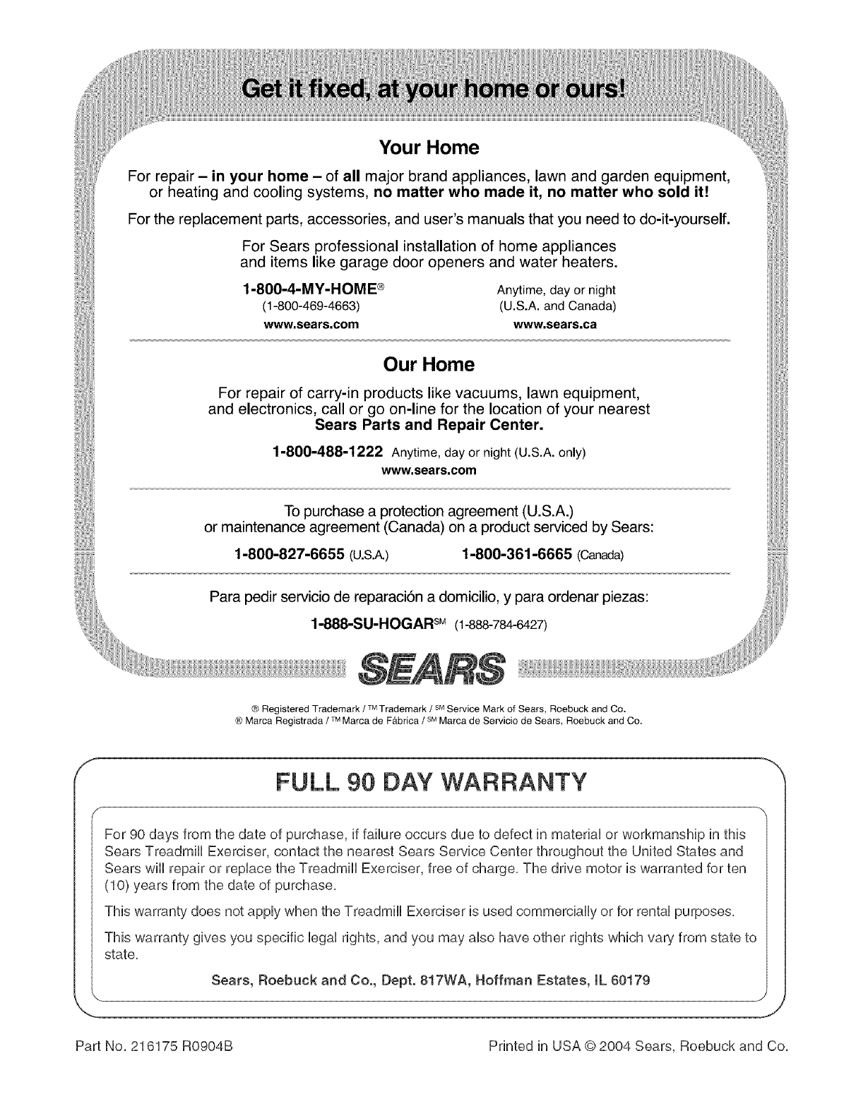 Part No, 216175 RO904B Printed in USA © 2004 Sears, Roebuck and Co,