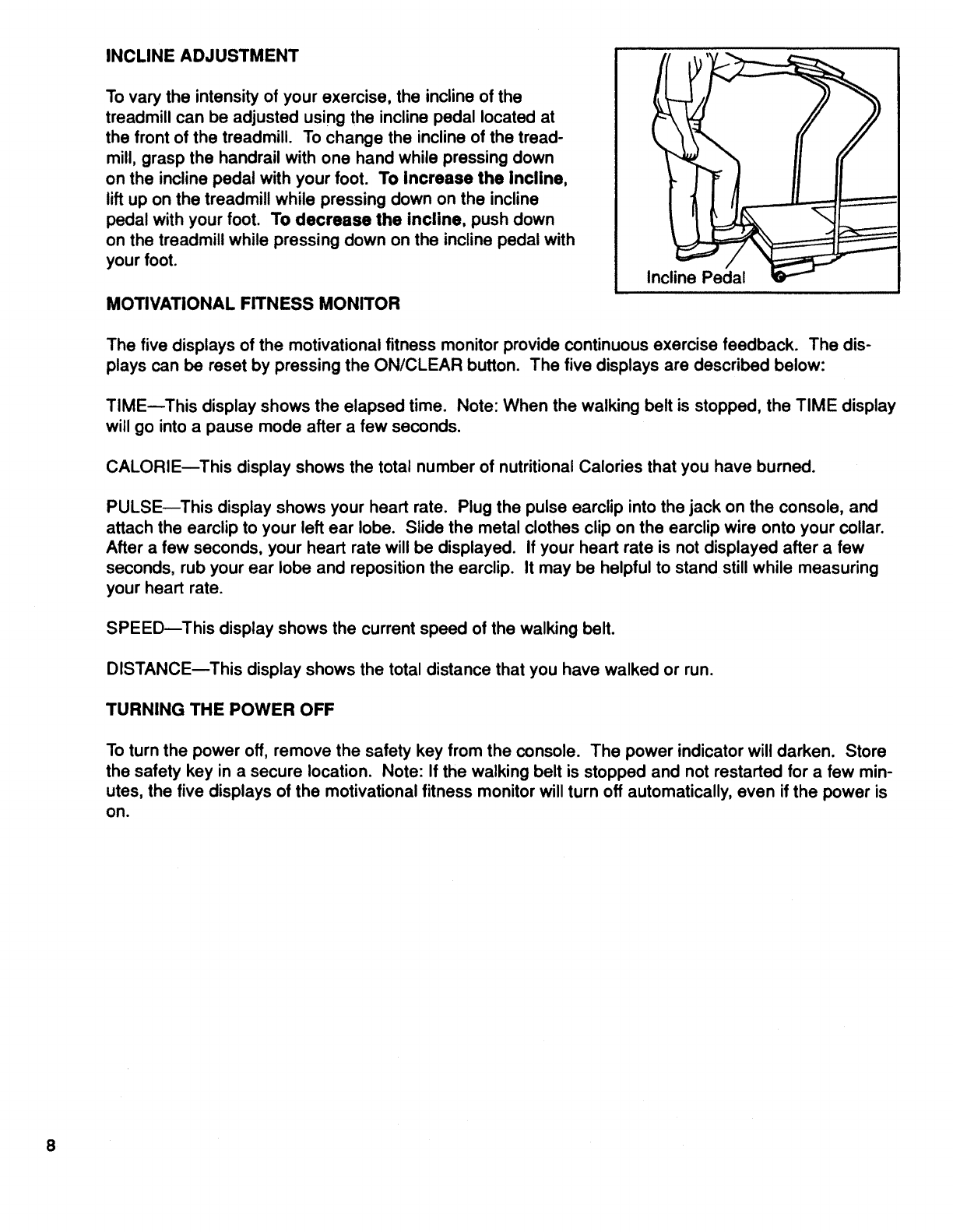 1. Position the treadmill on a level surface, wlth at least 8 feat of clearance behlnd the tread-