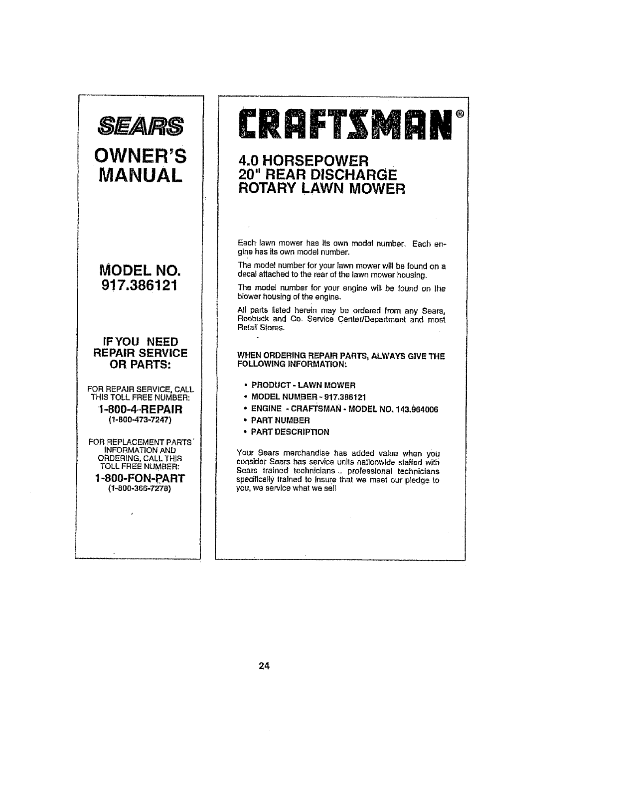 917386121 917386121 CRAFTSMAN ROTARY LAWN MOWER - Manuals and Guides L0710617 View the owners manual for your CRAFTSMAN ROTARY LAWN MOWER #917386121. Home:Lawn & Garden Parts:Craftsman Parts:Craftsman ROTARY LAWN MOWER Manual
