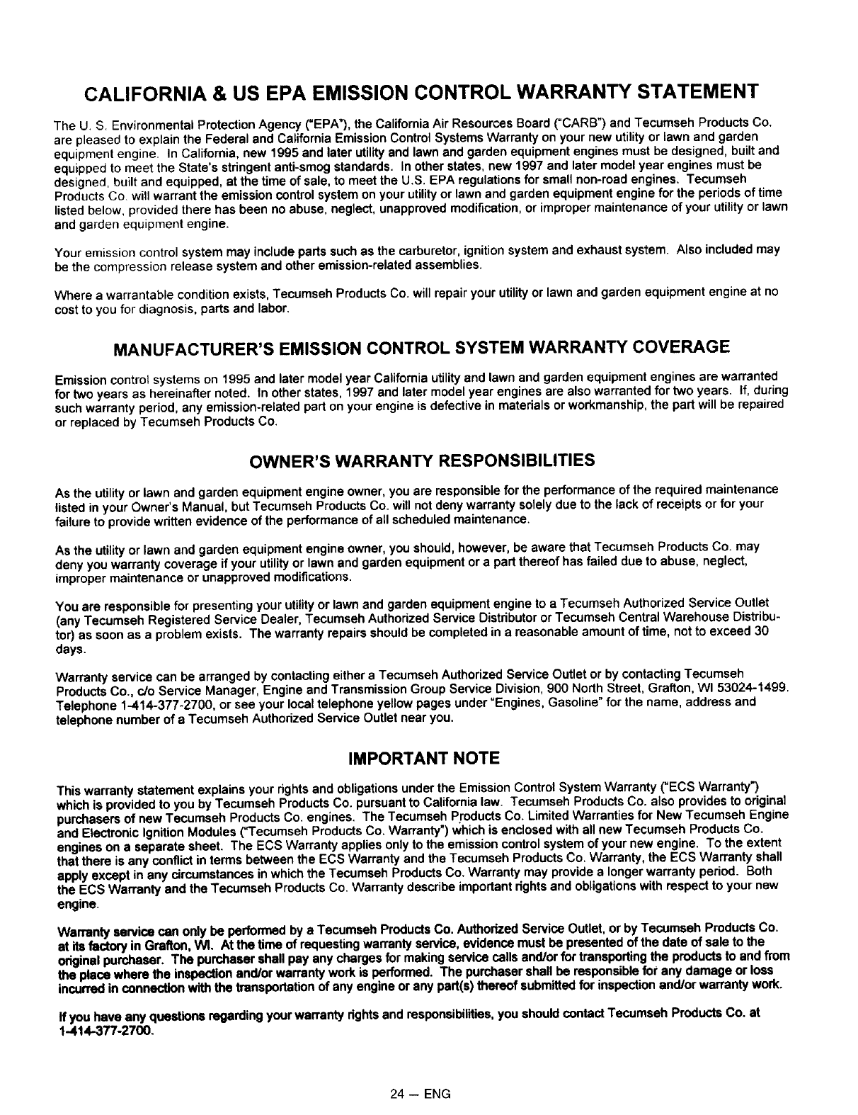 If you have any questions regarding your warranty dghts and responsibilities, you should contact Tecumseh Products Co. at