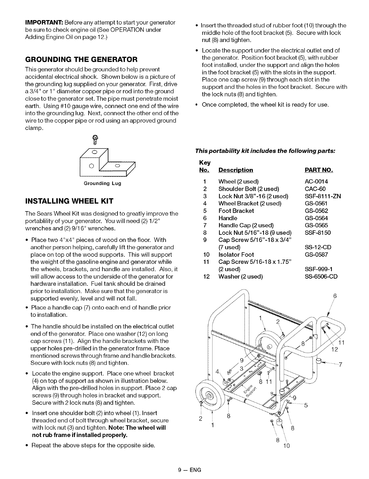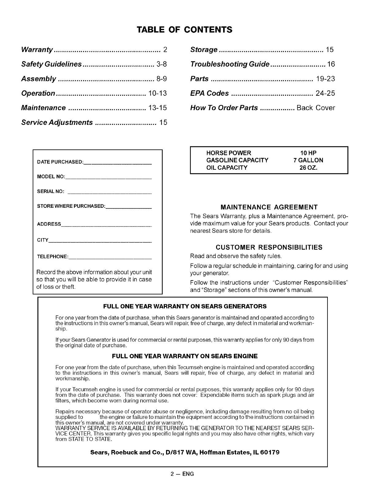 WARRANTY SERVICE IS AVAILABLE BY RETURNING THE GENERATOR TO THE NEAREST SEARS SER-