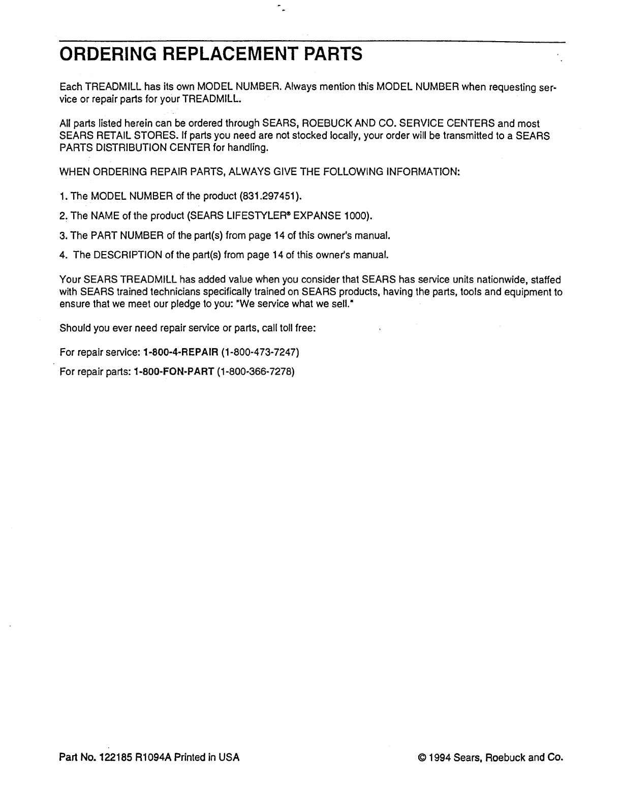 Part No. 122185 R1094A Printed in USA © 1994 Sears, Roebuck and Co.