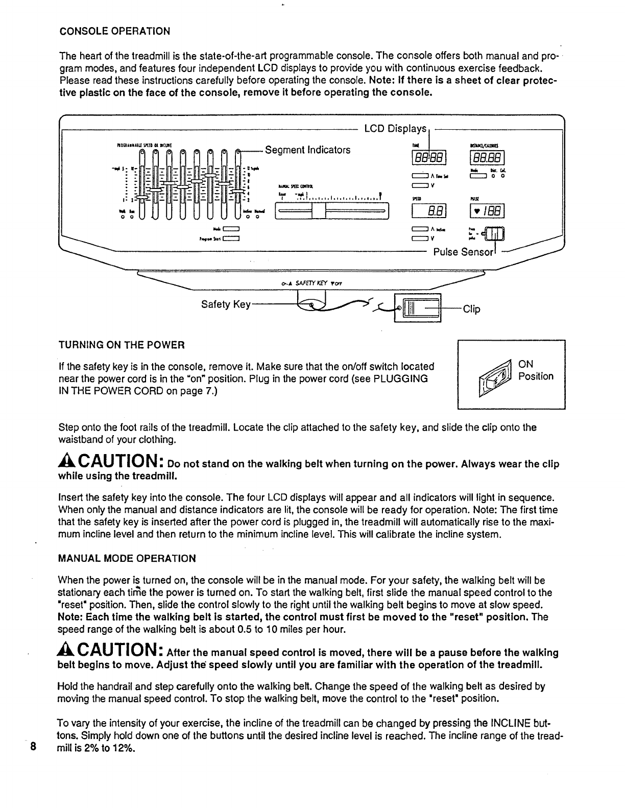 1. Position the treadmill on a level surface, with at least 8 feet of clearance behind the treadmill. Do not