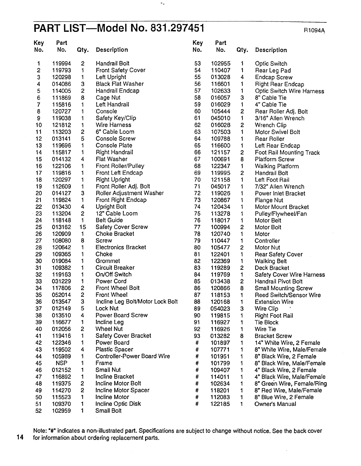51 109370 1 Incline Optic Disk # 122185 1 Owner's Manual