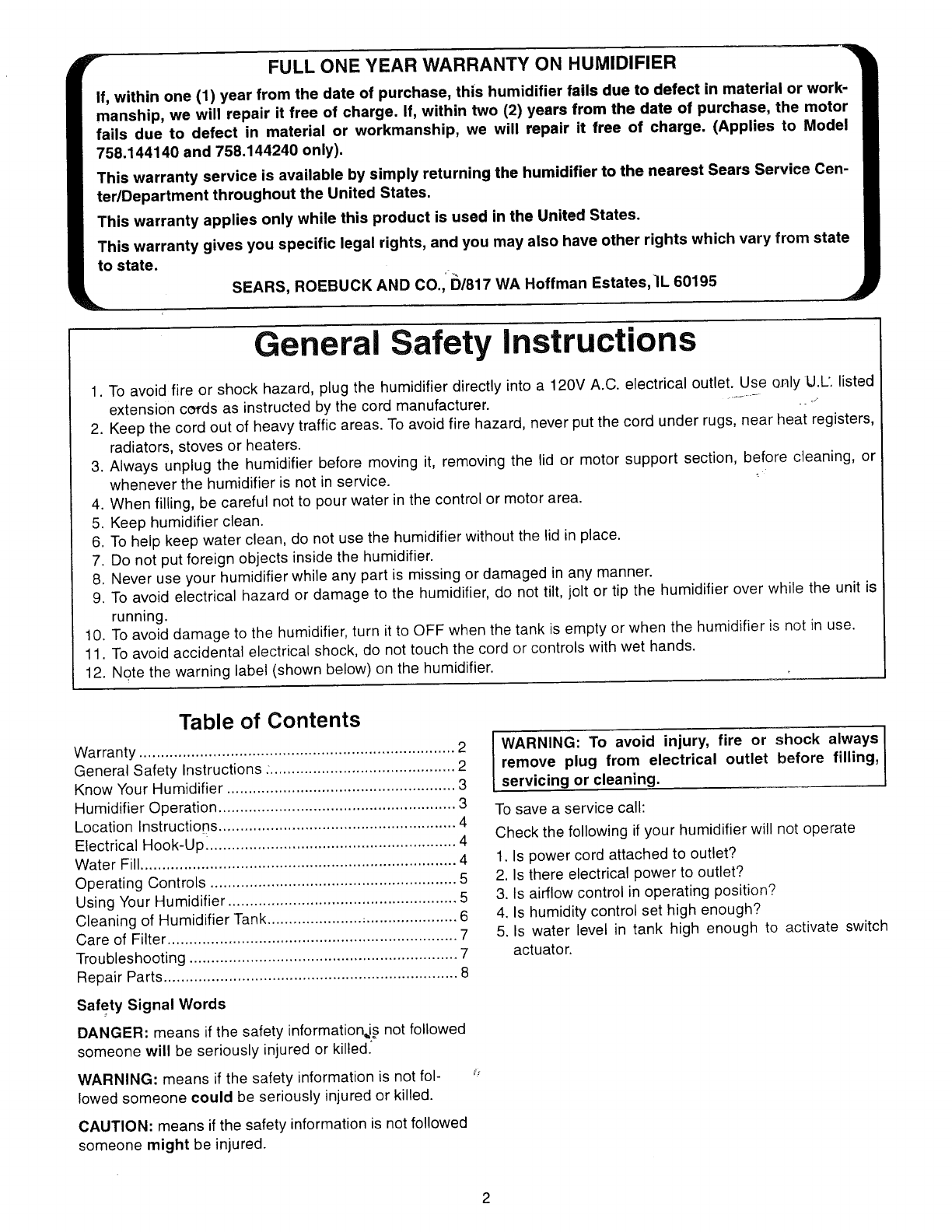 This warranty service is available by simply returning the humidifier to the nearest Sears Service Cen-
