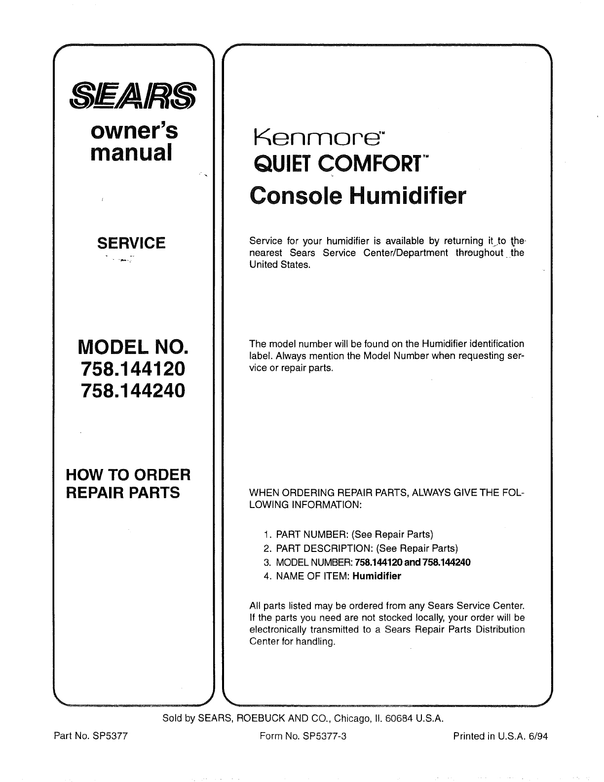 758144120 758144120 KENMORE HUMIDIFIER - Manuals and Guides L0809451 View the owners manual for your KENMORE HUMIDIFIER #758144120. Home:Heating & Cooling Parts:Kenmore Parts:Kenmore HUMIDIFIER Manual