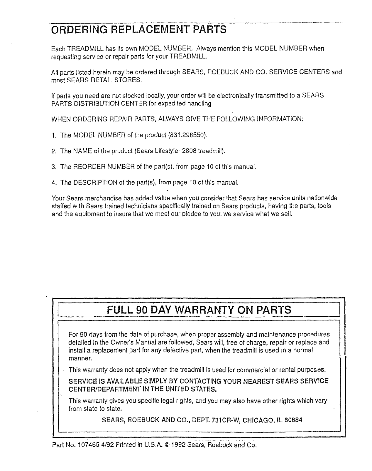 Part No, 107465 4/92 Piinted in U.&A. © 1992 Sears, Roebuck and Co,