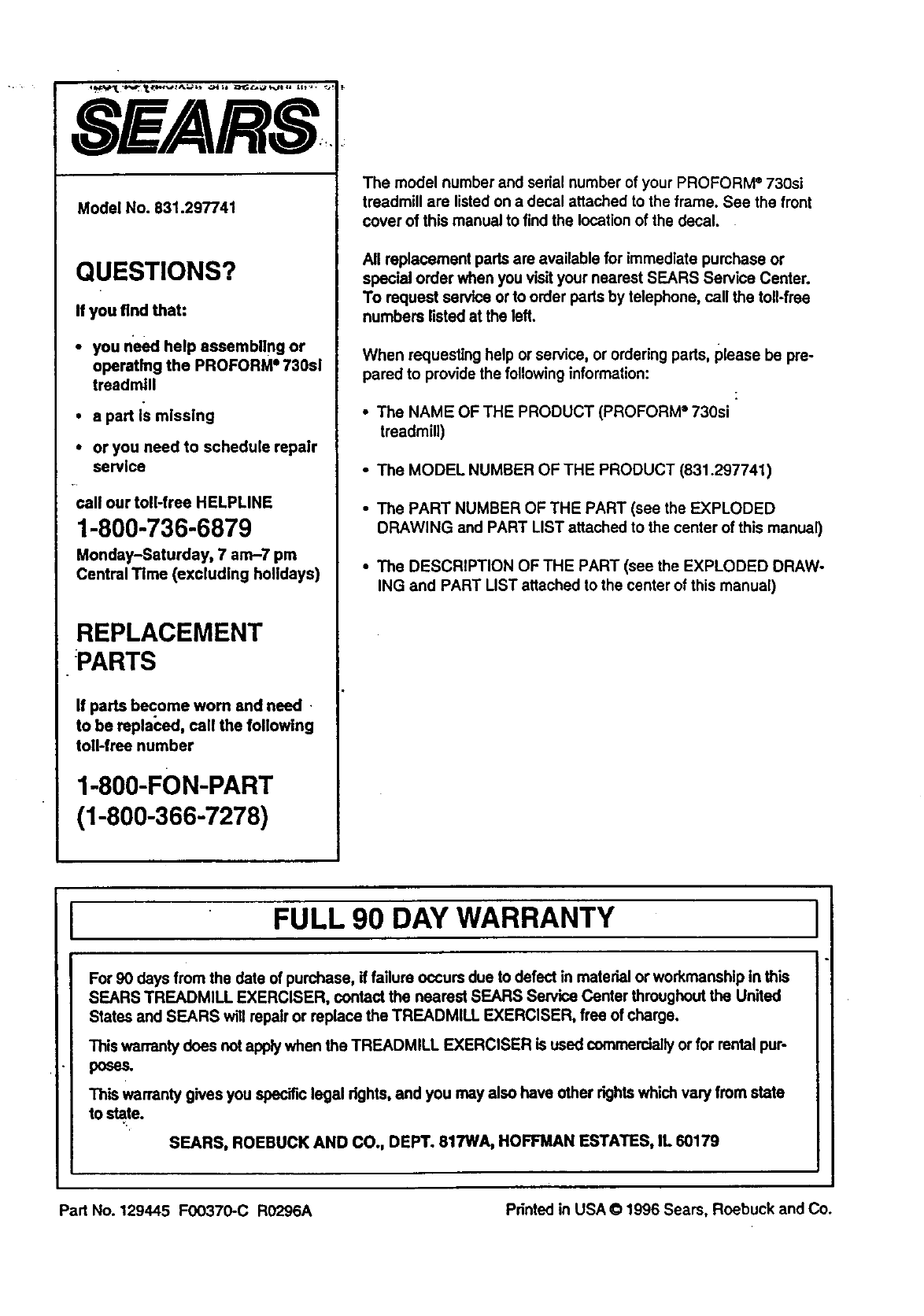 Part No. 129445 F00370-C R0296A Pdnted in USA © 1996 Sears, Roebuck and Co.
