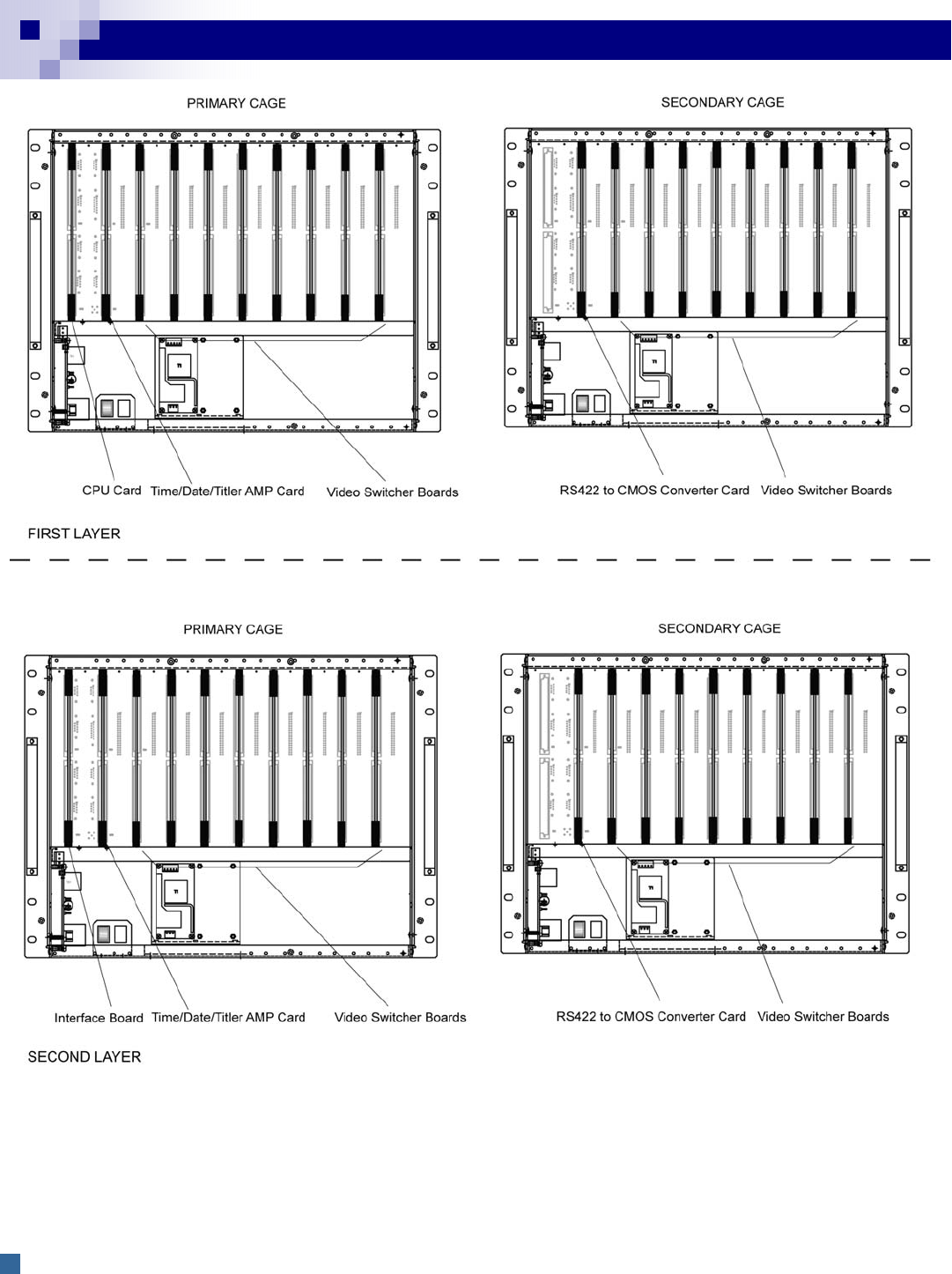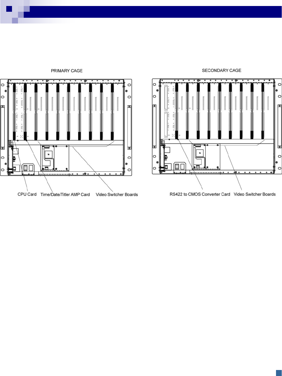 cage system. The secondary cage contains the RS422 to CMOS Converter card and additional Video Switcher boards.