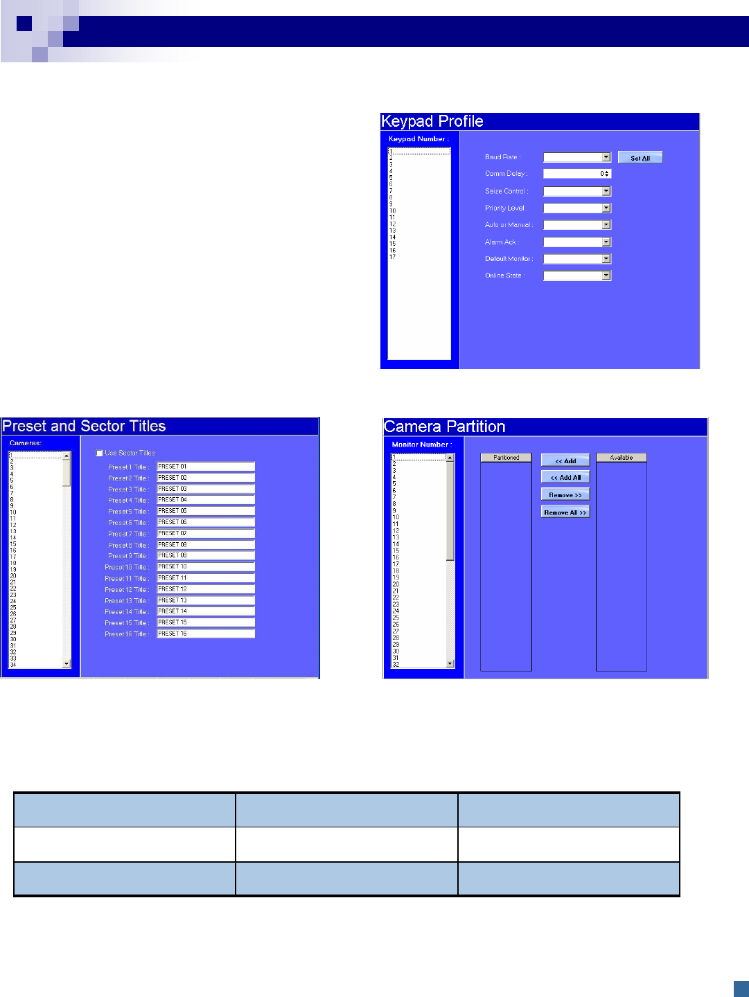 • Partitioning - listing cameras accessible to specific monitors; listing monitors accessible to specific keypads