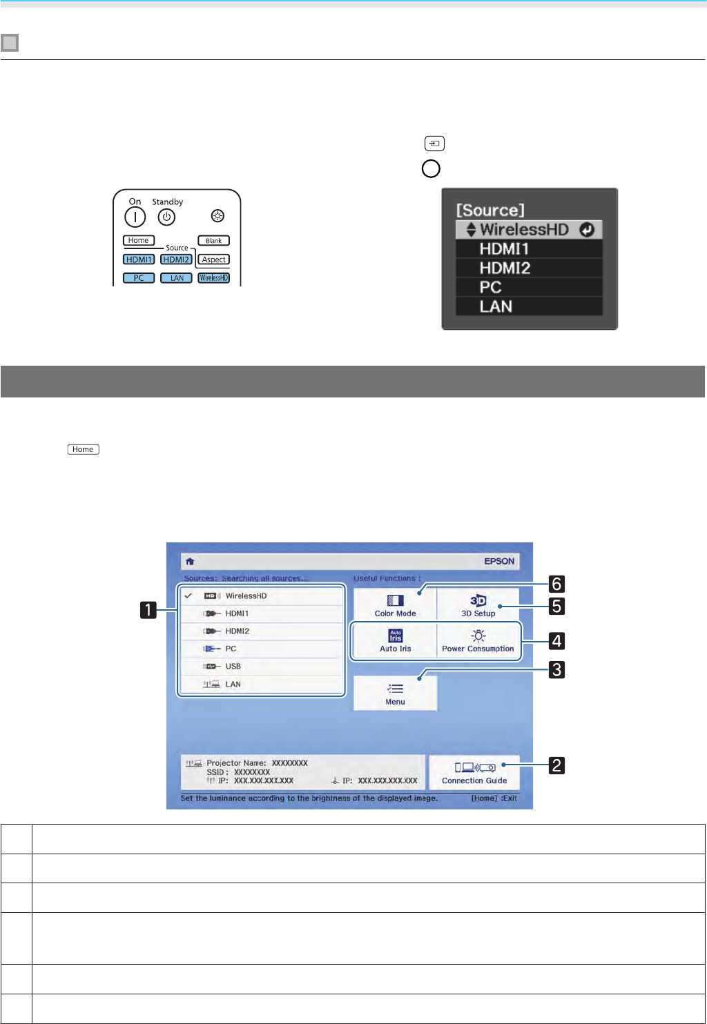 •You can output images from the projector or a monitor device such as TV. You can switch the output