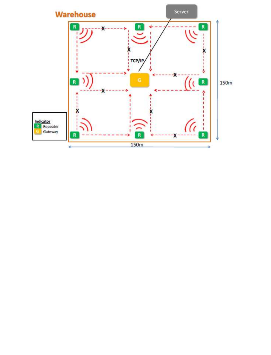 The following is a diagram illustrating the network layout for a 150 meter x 150 meter warehouse: