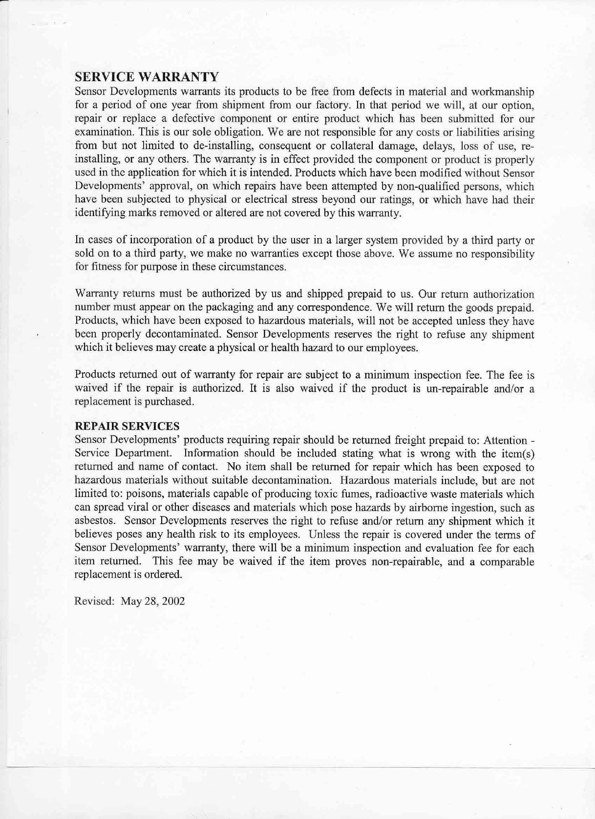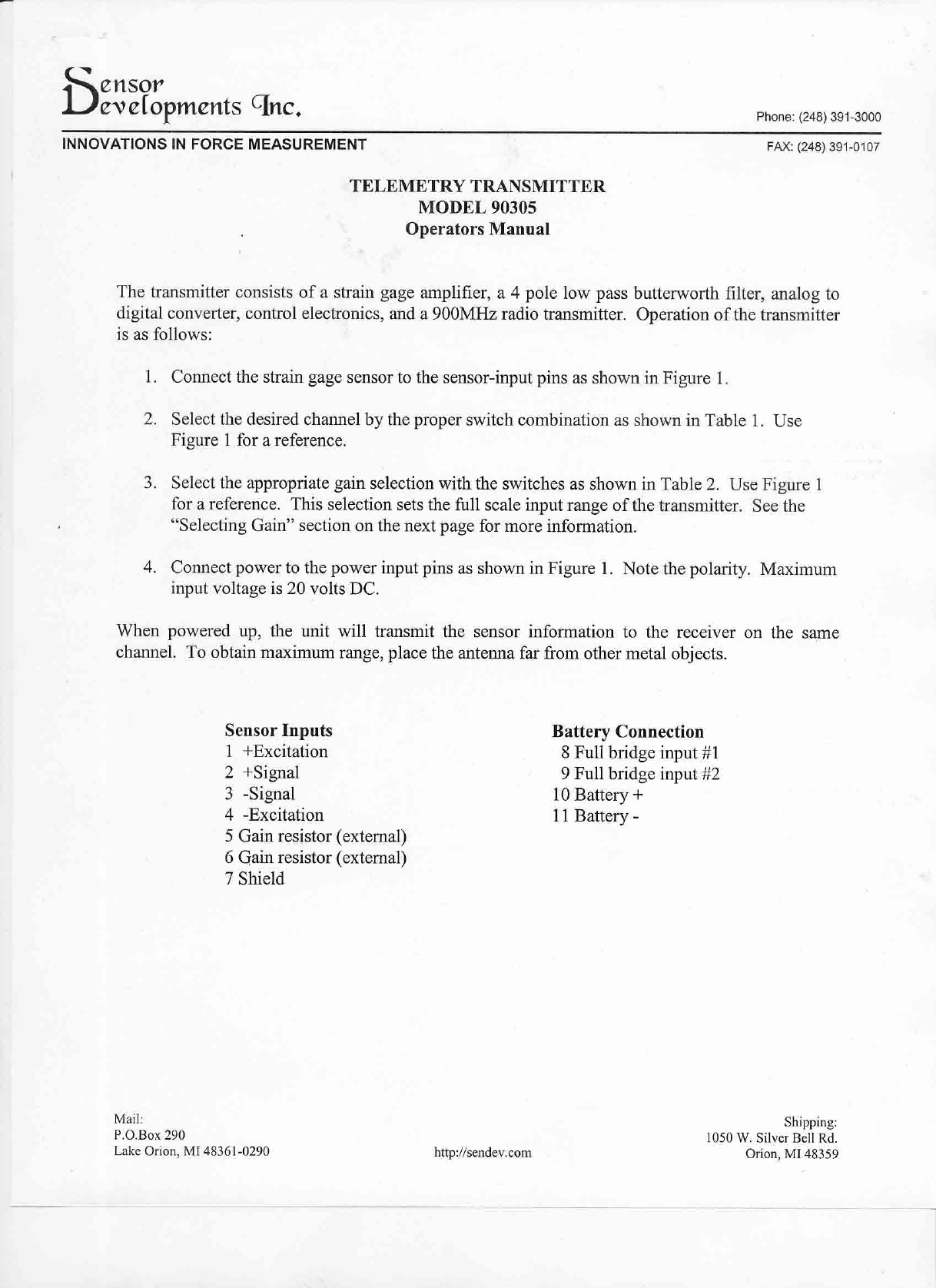 Sensor Developments Inc. Telemetry Transmitter Users Manual