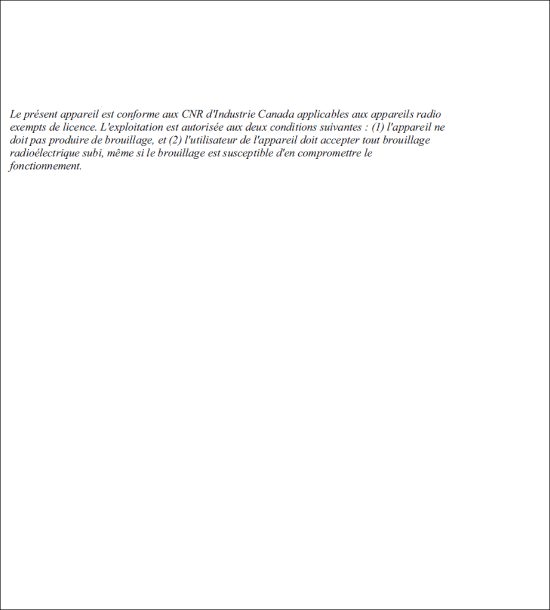 This device complies with part 15 of the FCC Rules and to RSS210 of Industry Canada.