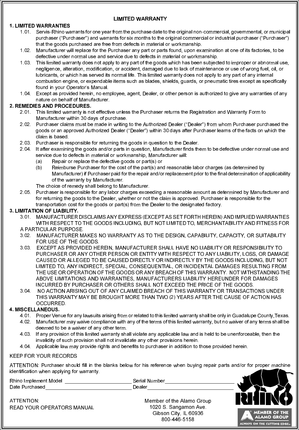 In addition to the standard Limited Warranty shown on the facing page, Rhino also provides: