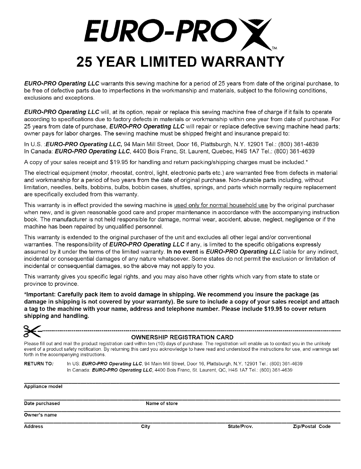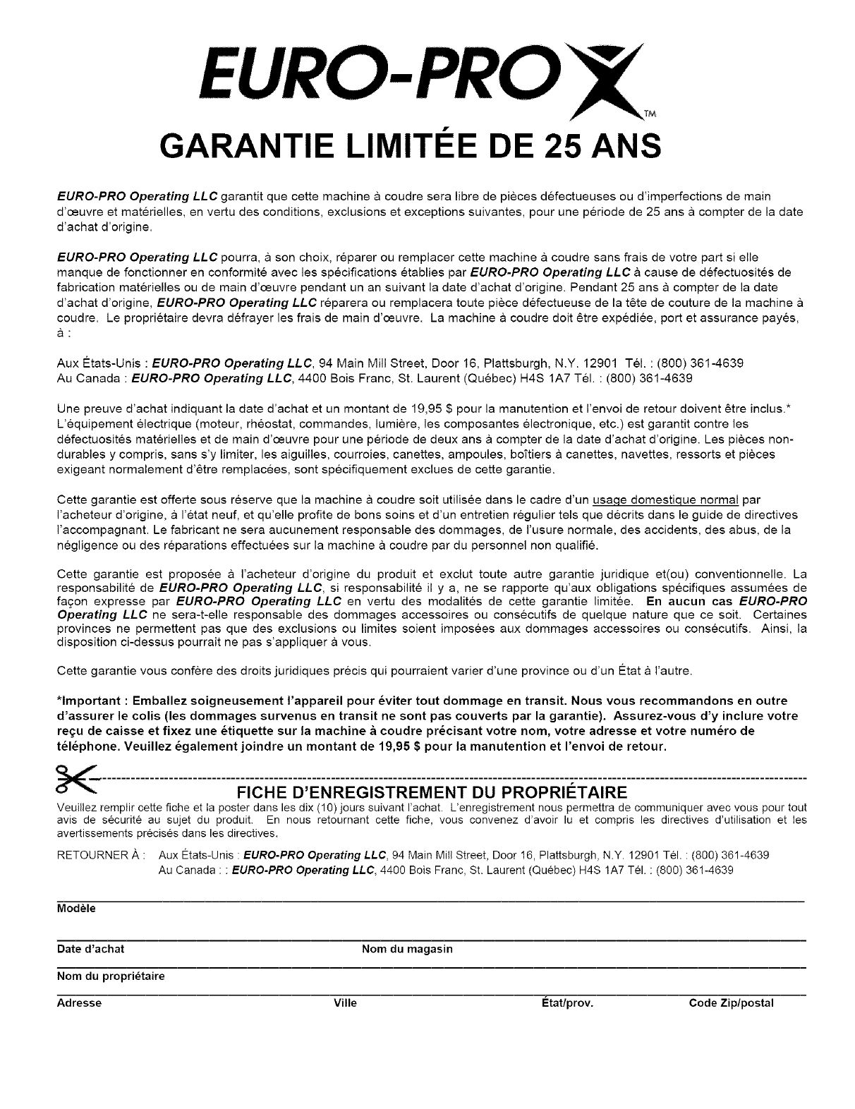 EURO-PRO Operating LLC garantit que cette machine a coudre sera libre de pieces defectueuses ou d'imperfections de main