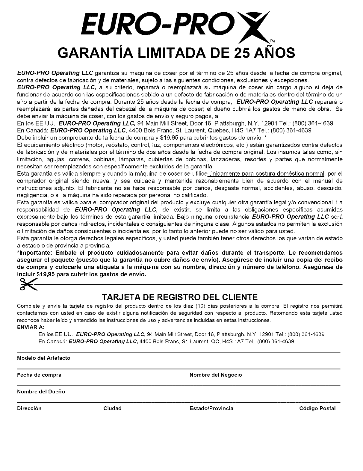 EURO-PRO Operating LLC garantiza su maquina de coser por el termino de 25 ados desde la fecha de compra original,