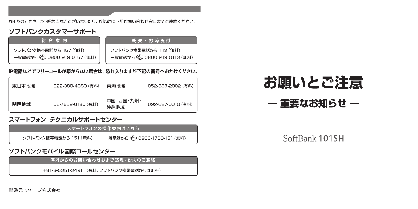 このたびは、SoftBank 101SHをお買い上げいただき、