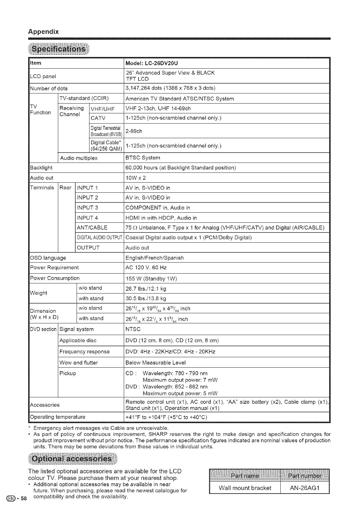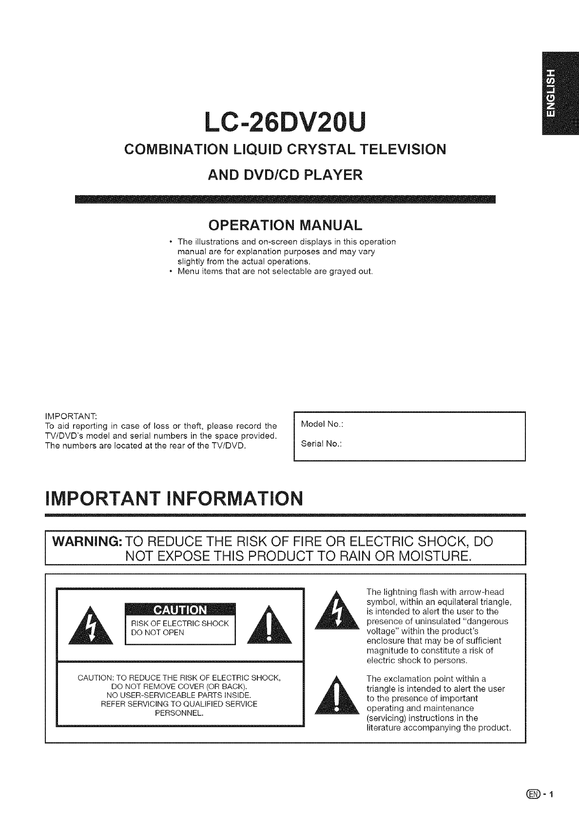 User Manual: Sharp LC-26DV20U LC-26DV20U SHARP TV LCD - Manuals and Guides View the owners manual for your SHARP TV LCD #LC26DV20U. Home:Electronics Parts:Sharp Parts:Sharp TV LCD Manual