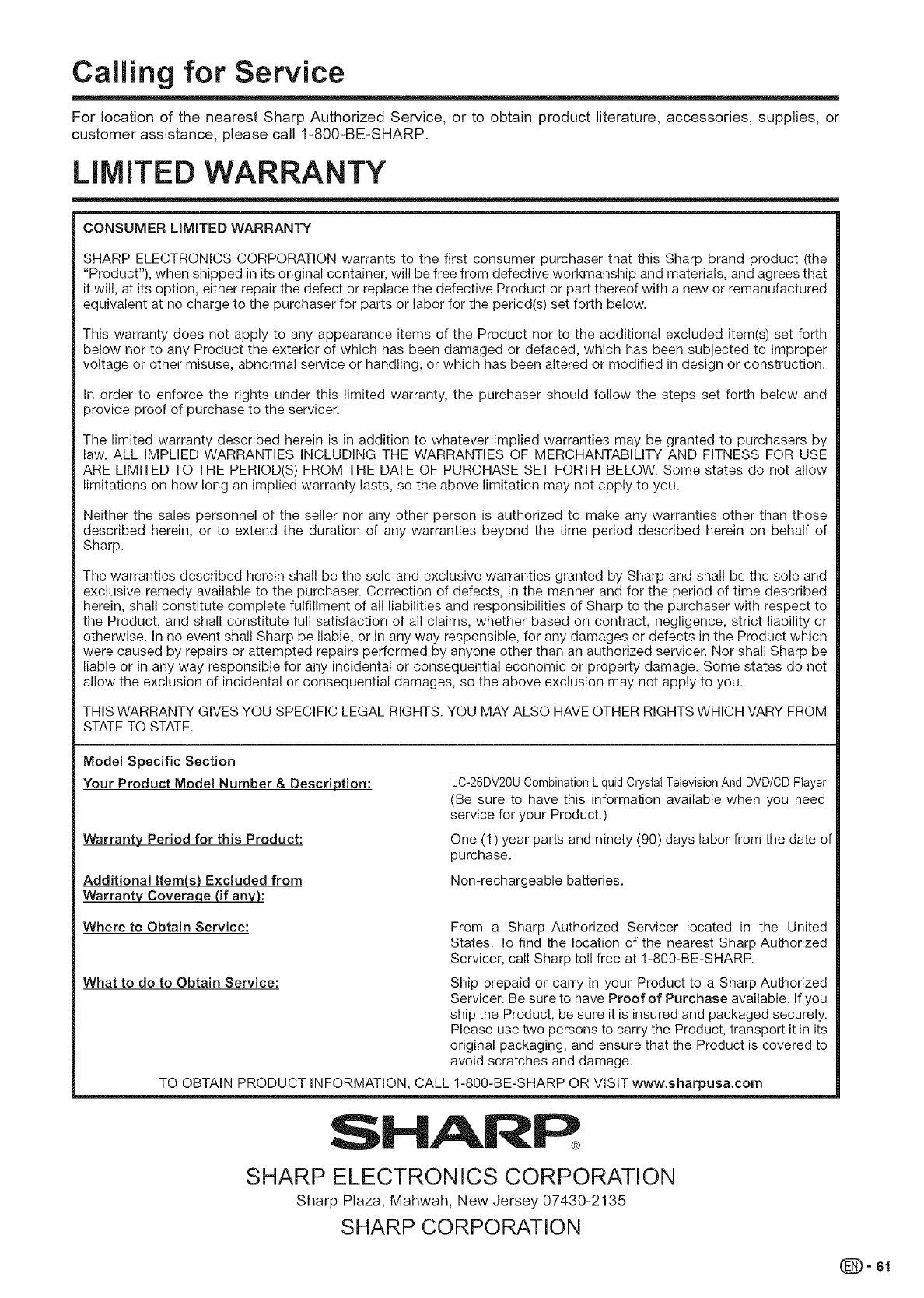 What to do to Obtain Service: Ship prepaid or carry in your Product to a Sharp Authorized