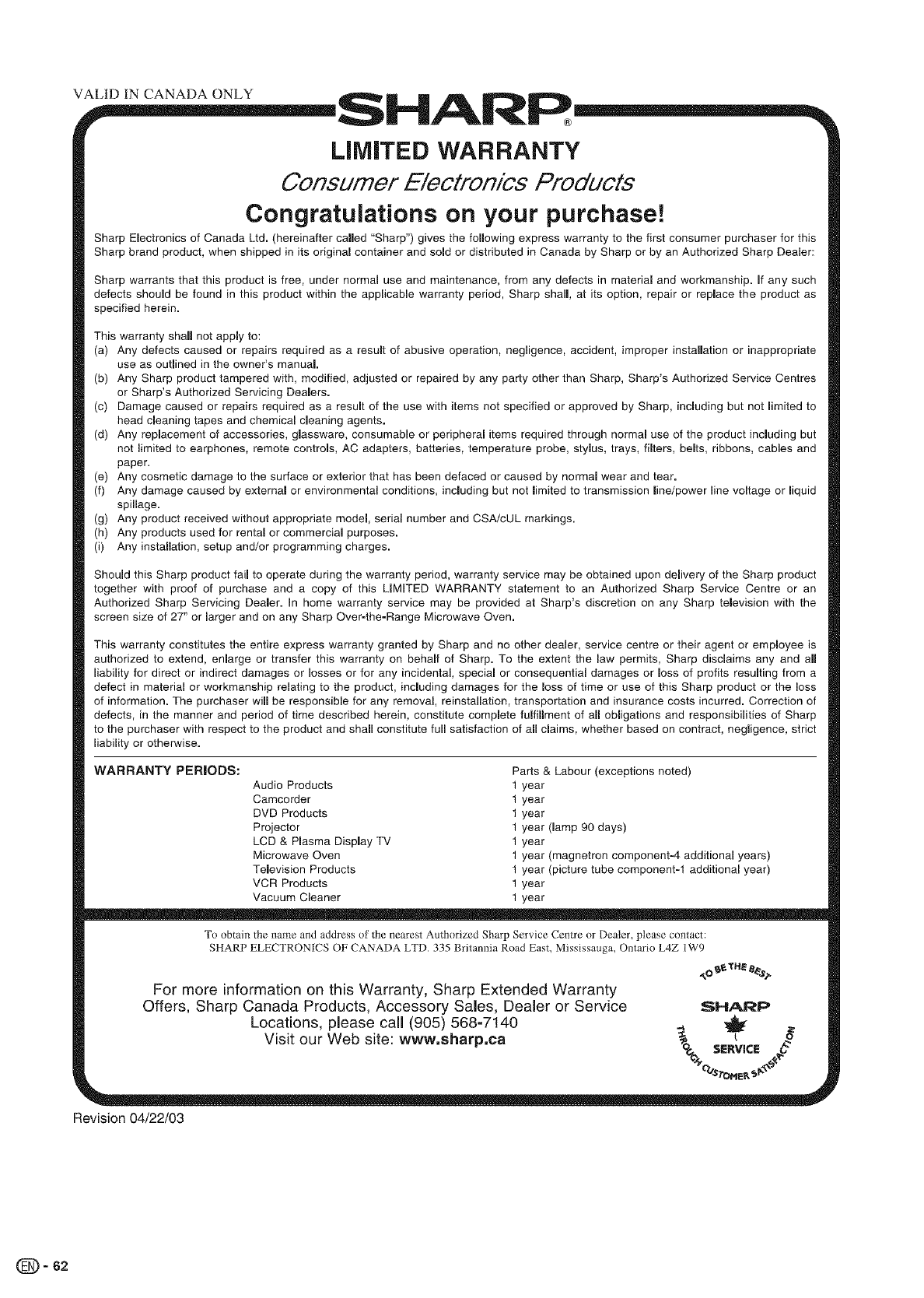 Sharp Electronics of Canada Ltd. (hereinafter called "Sharp") gives the following express warranty to the first consumer purchaser for this