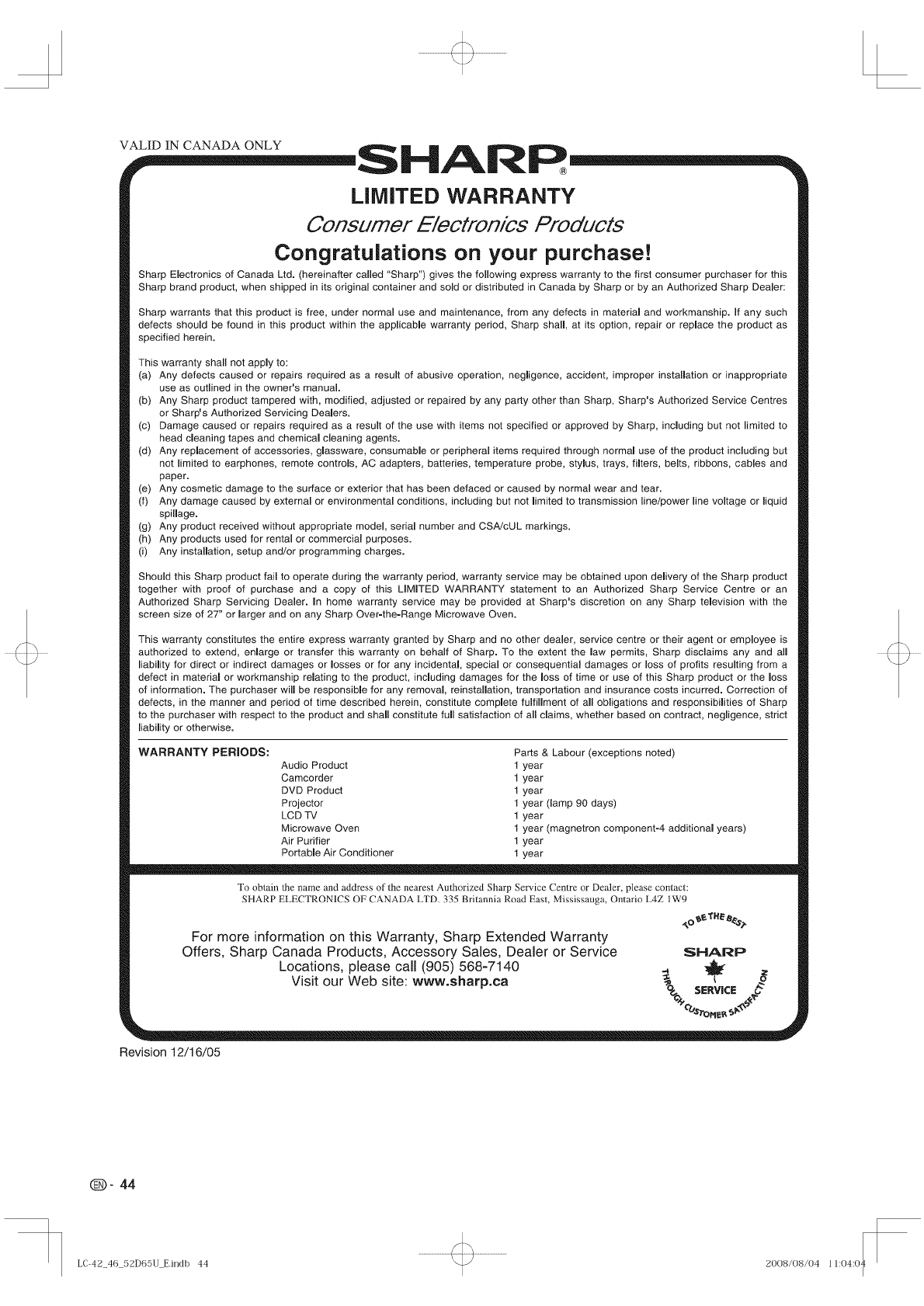 authorized to extend, enlarge or transfer this warranty on behalf of Sharp. To the extent the law permits, Sharp disclaims any and all