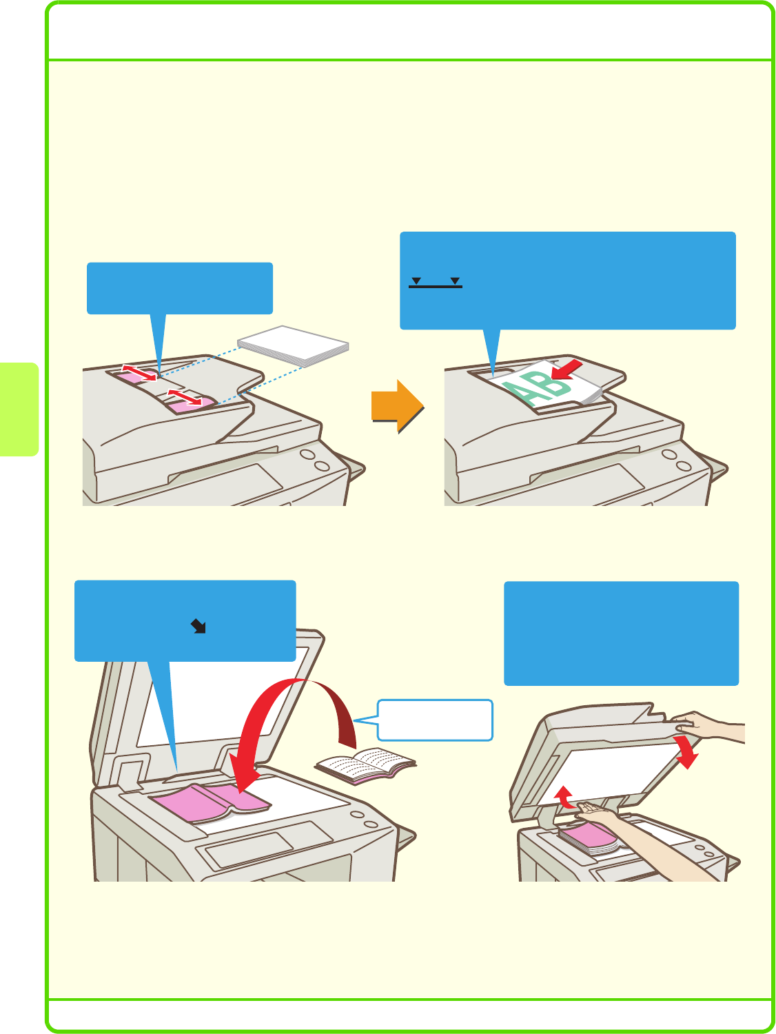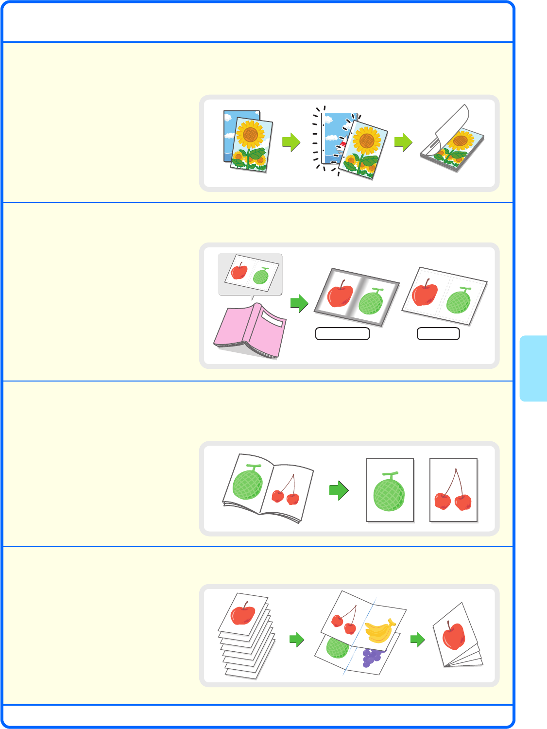 - Scanning the left and right pages of a bound document as two separate pages (Dual Page Scan)