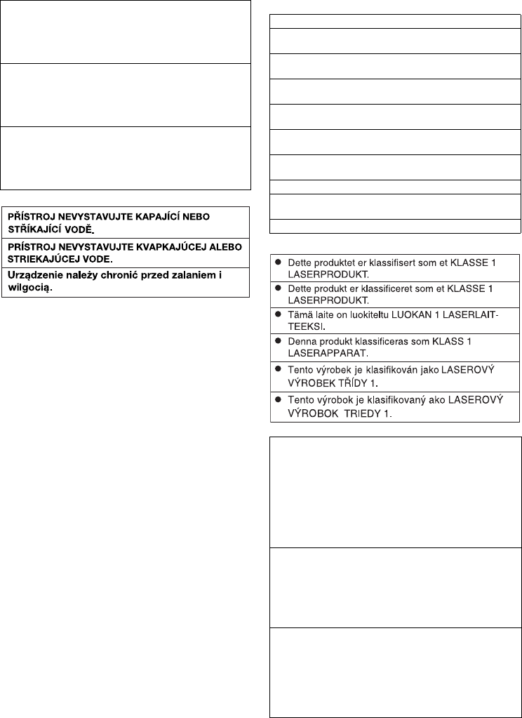 - Tulipalon tai sähköiskun välttämiseksi laitetta ei saa altistaa tippuvalle tai roiskuvalle vedelle. Nestettä sisältäviä astioita kuten esim kukkamaljakoita ei saa asettaa laitteen päälle.
