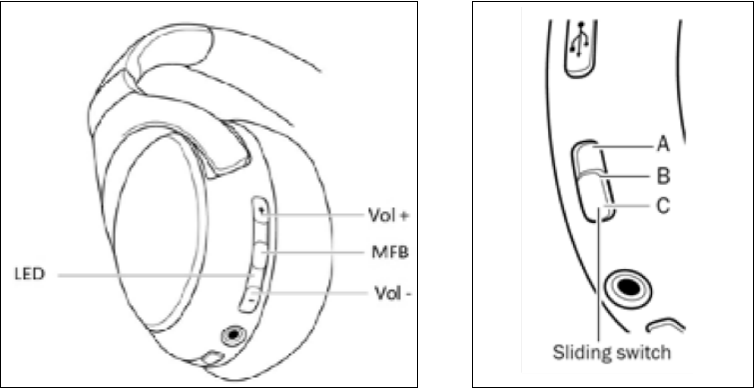 1. Set the sliding switch to position B or C. The headphones will then be in pairing mode.