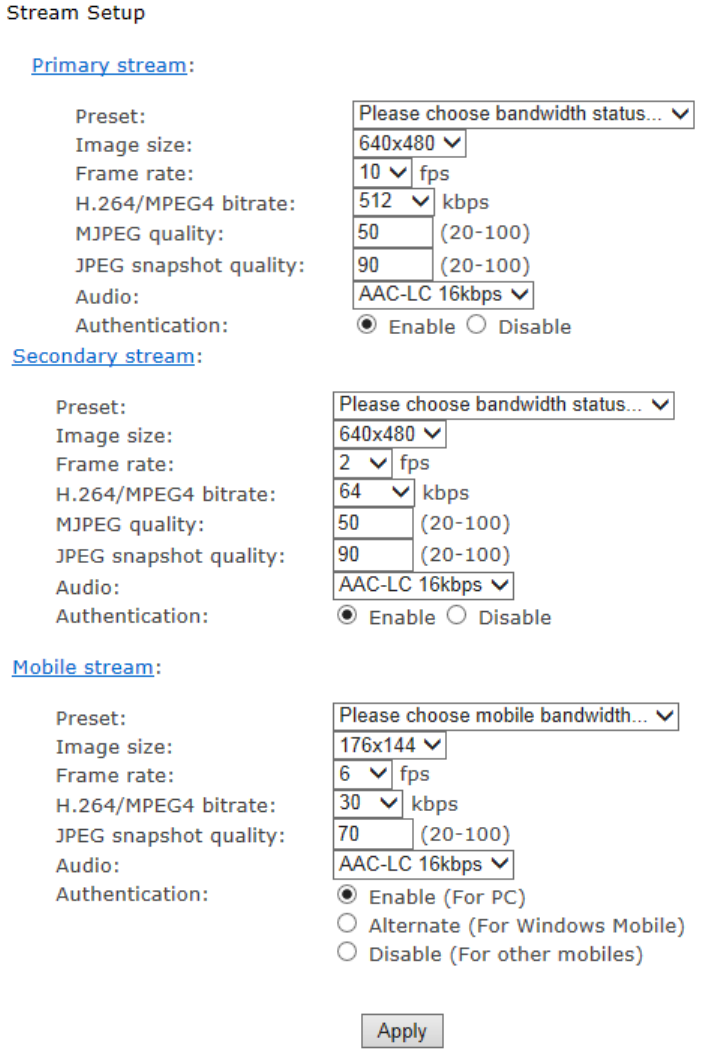 The camera supports three streams: primary stream, secondary stream and mobile stream. ........ 24
