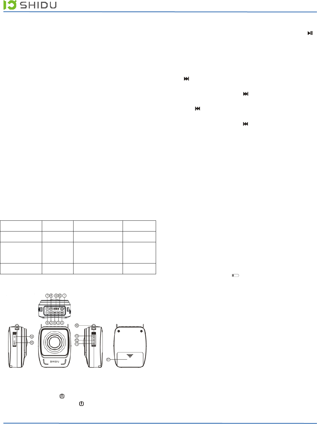 (Note: in Bluetooth mode, long press “ ” not support fast forward.)