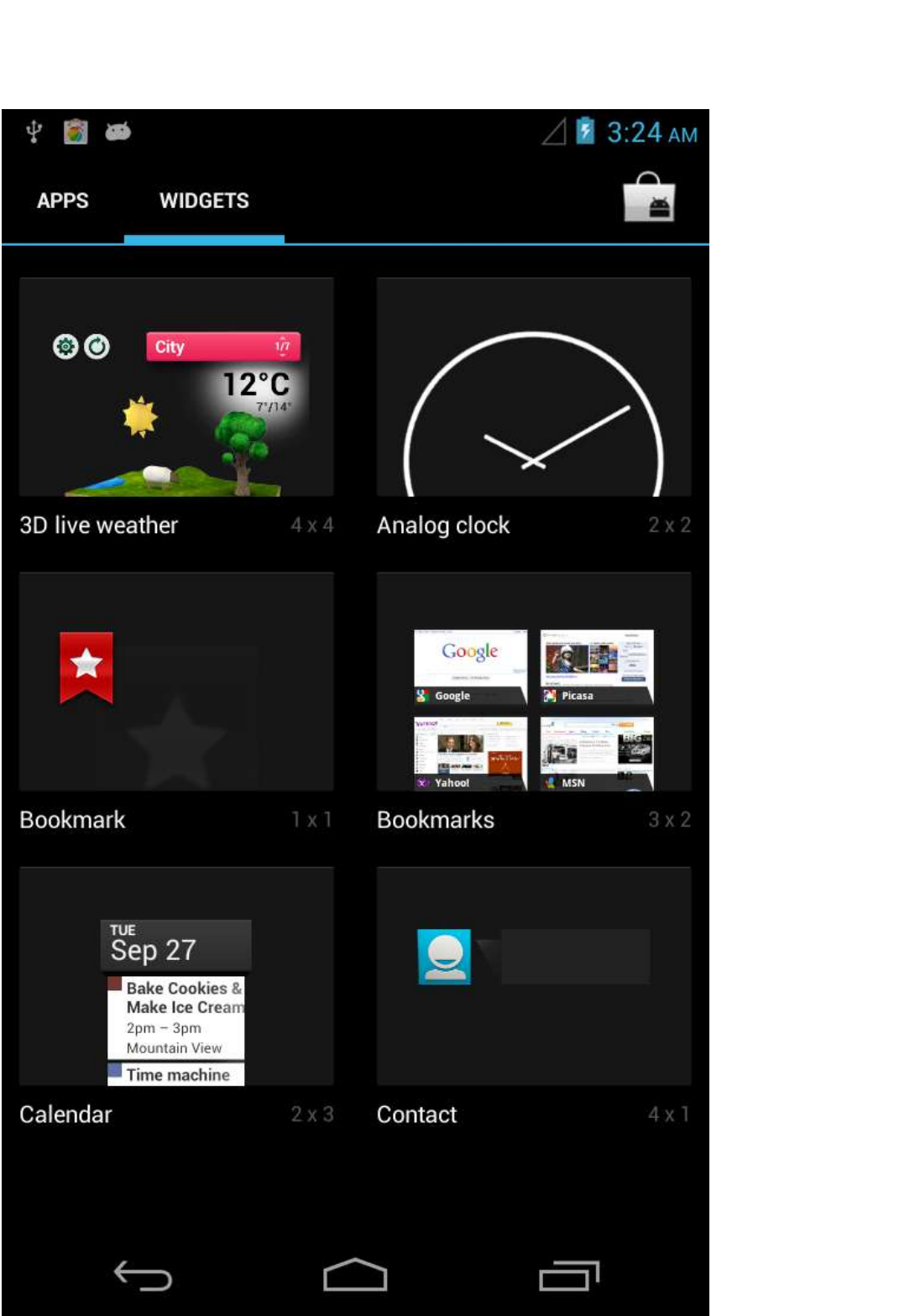 Tap the Apps icon (circle with six squares) and tap the Widgets page, then press a widget and drag to the desktop