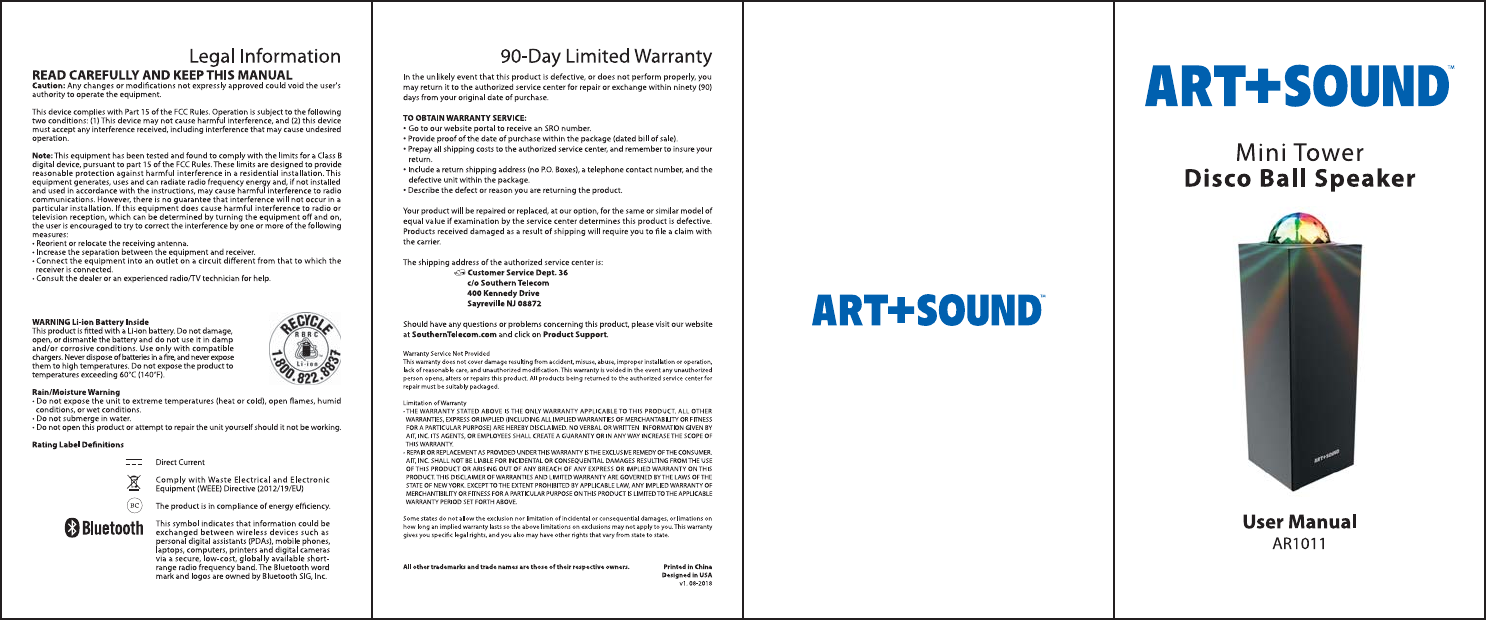 ShenZhen Super Global Electronics AR1011 BT DISCO BALL TOWER SPKR User Manual AR1011 FINAL 7 10 18 ISV OL