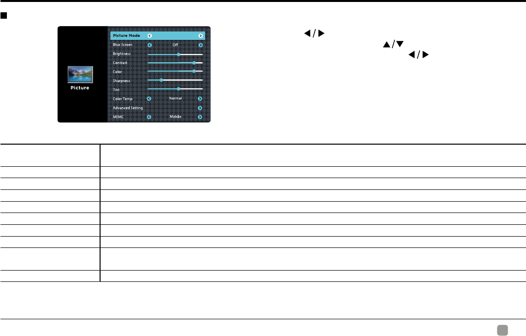 • Adjust the settings in the PICTURE menu.