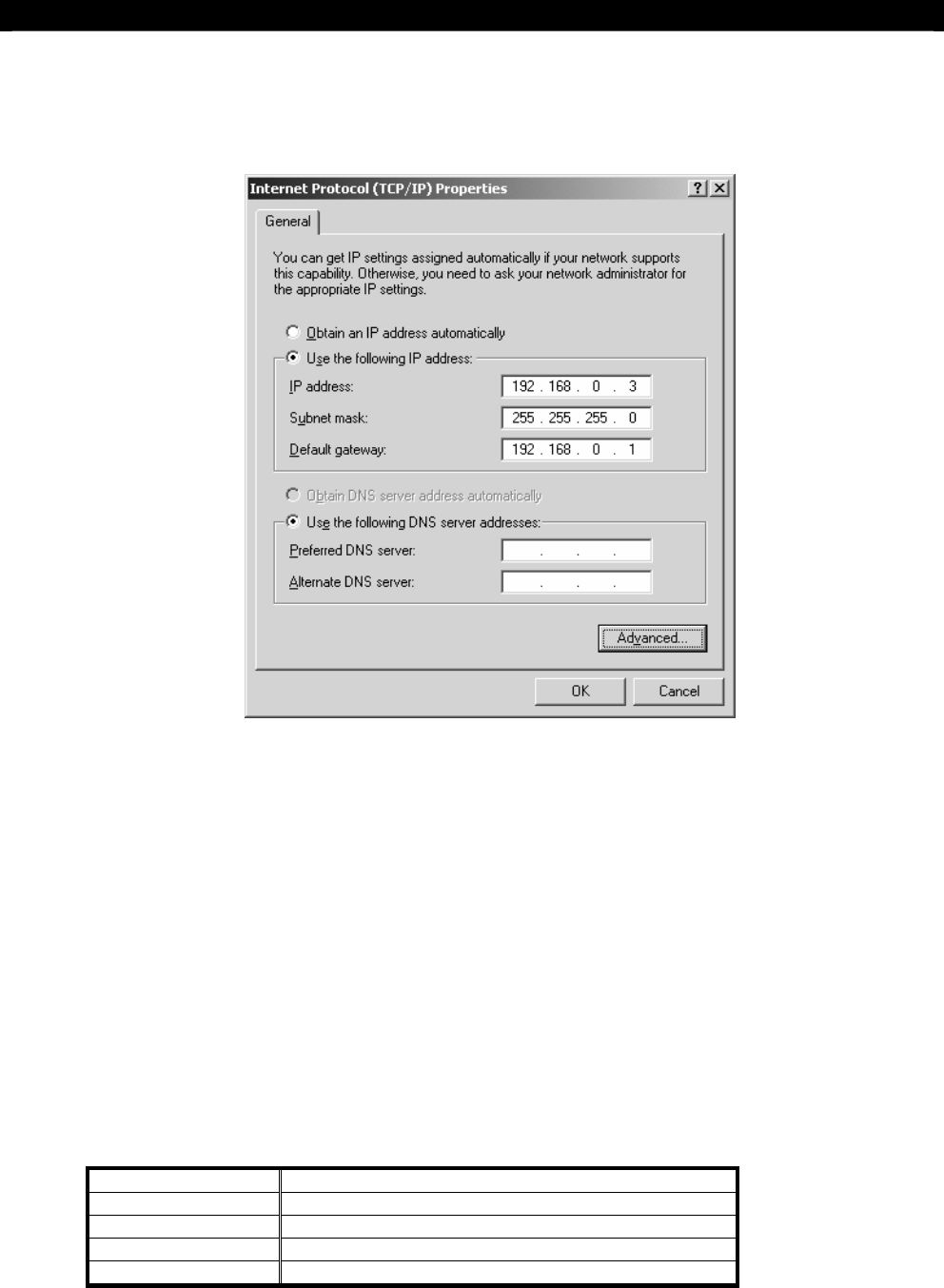 address “192.168.0.3” and subnet mask “255.255.255.0”