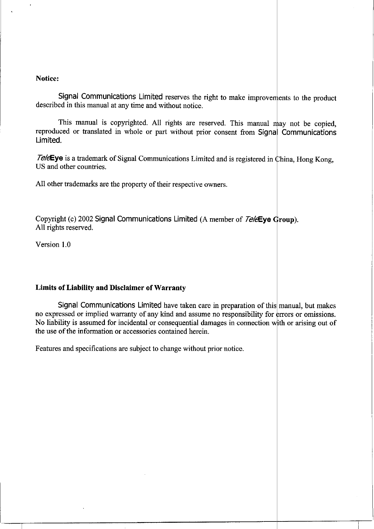 Signal Communications Limited TeleEye III+ Video Recording Transmitter Users Manual