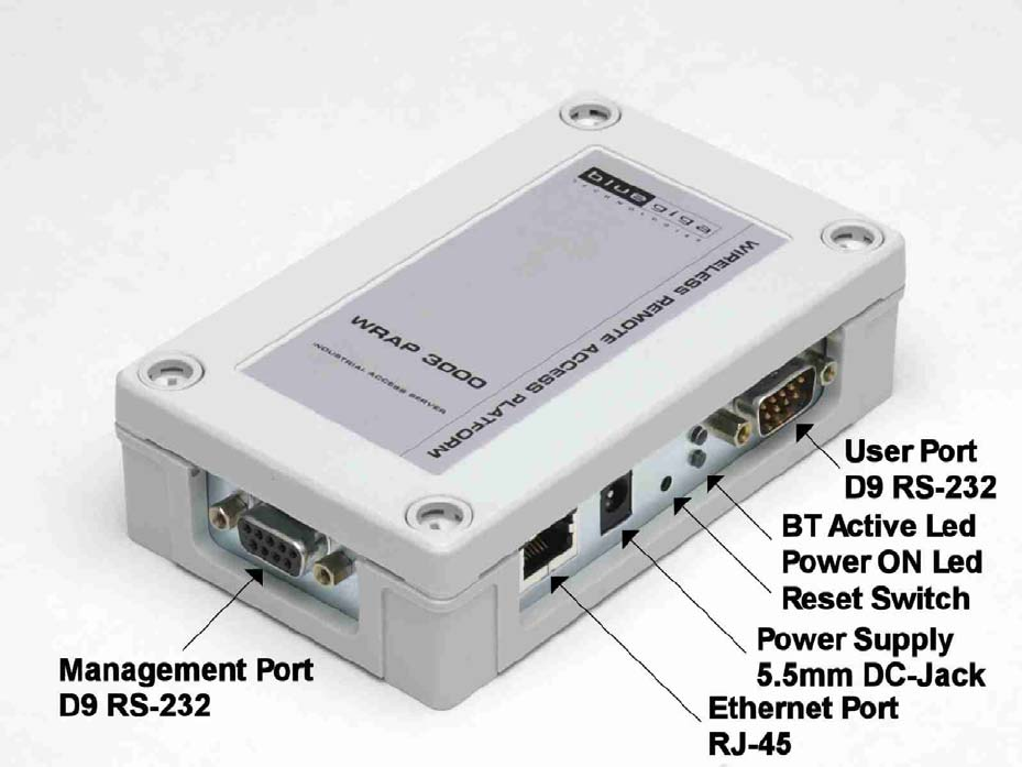 The WRAP 3000 Industrial Access Server is a compact Bluetooth Gateway with an Ethernet interface to