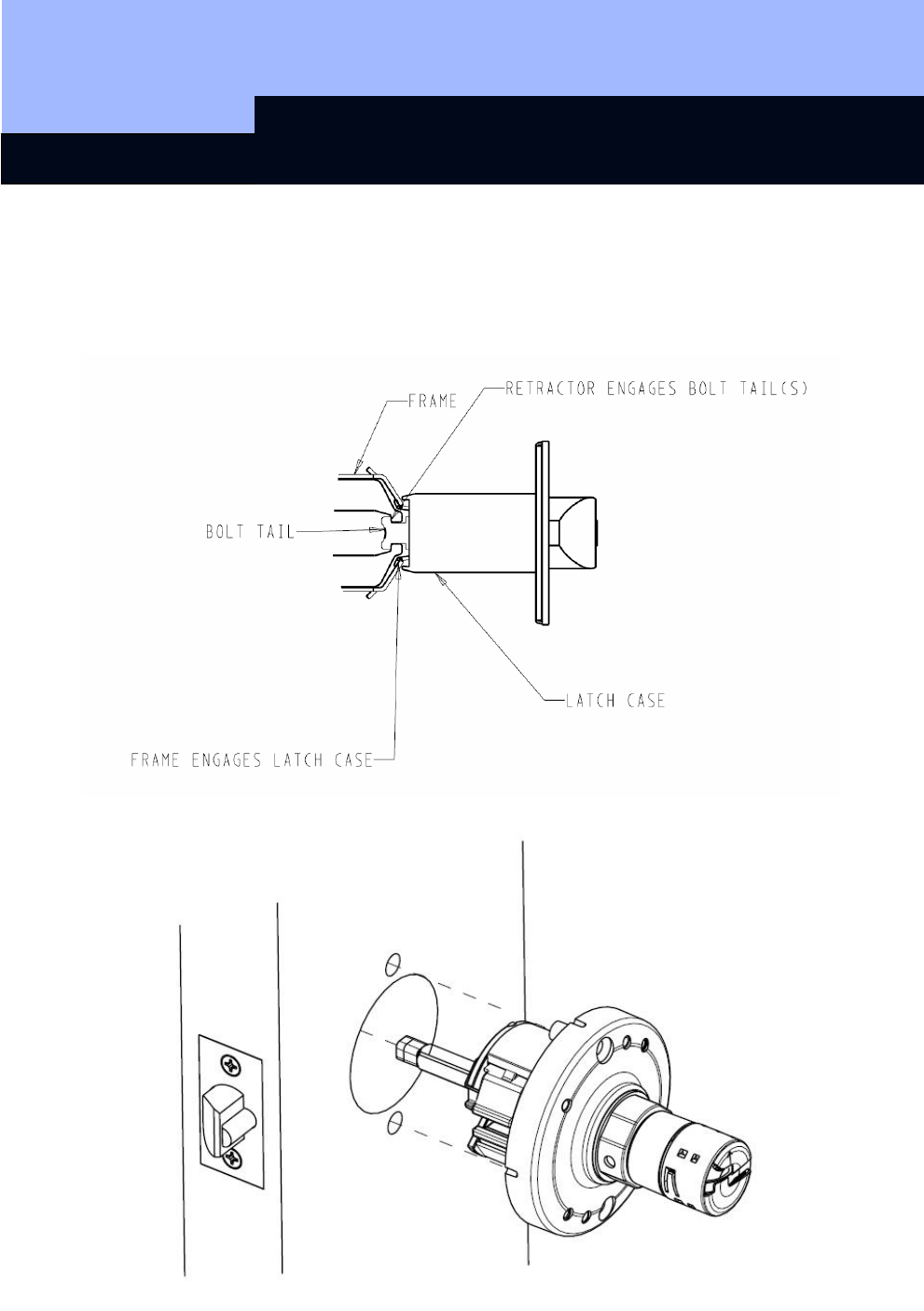 body frame hooks latch case and retractor engages bolt tail(s). DO NOT FORCE (If