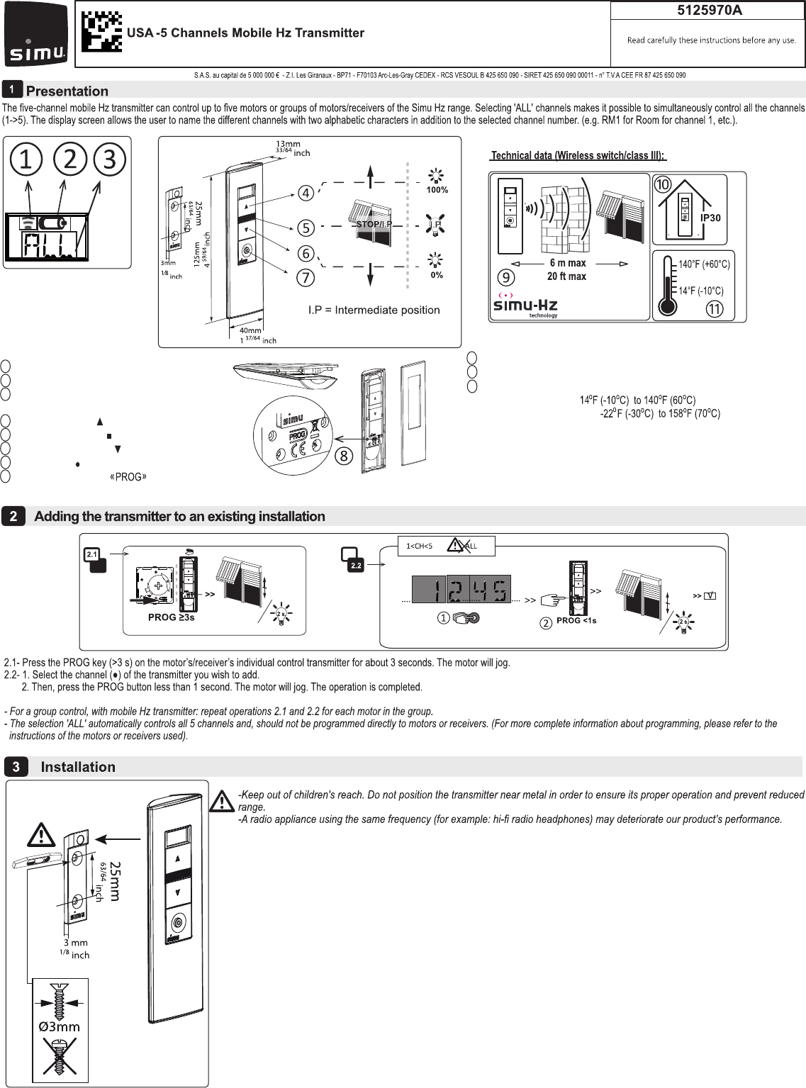 - Transmitter range: 20ft max. (6m max) throught 2 concrete walls in normal
