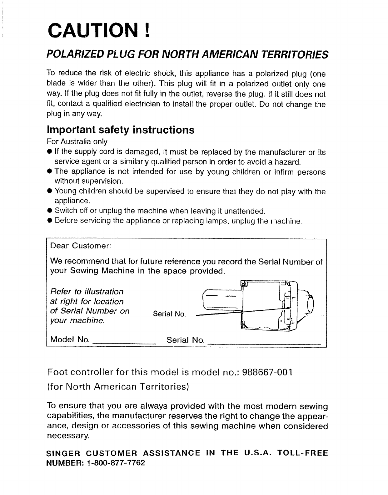 SINGER CUSTOMER ASSISTANCE IN THE U.S.A. TOLL-FREE