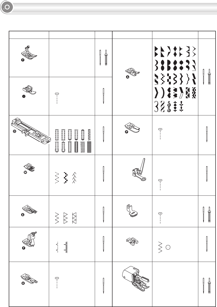 TABLEAU DES TYPES DE PIEDS PRESSEURS. . . . . . . . . . . . . . . . . . . . . . . . . . . . . . . . . . . . . . . . . . . . 21