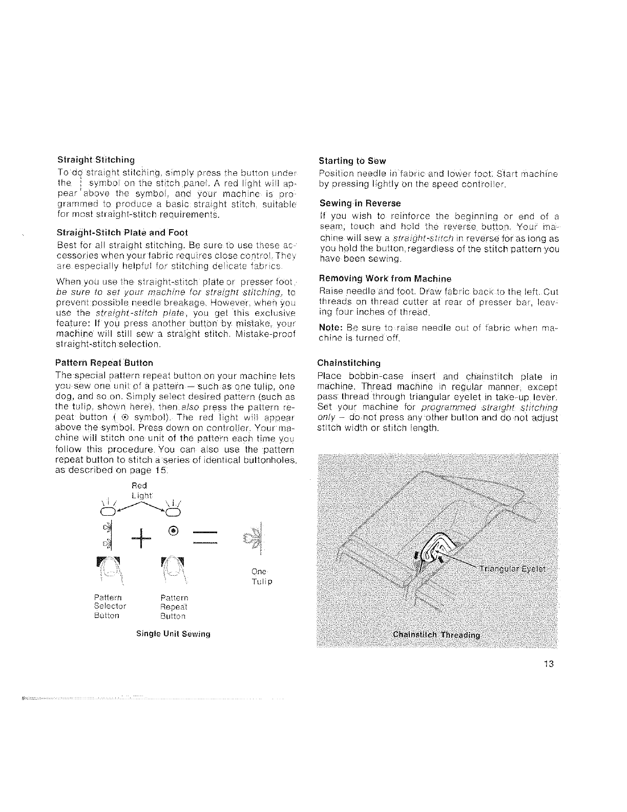 Pattern Repeat Button, Starting to Sew, Sewing in Reverse *