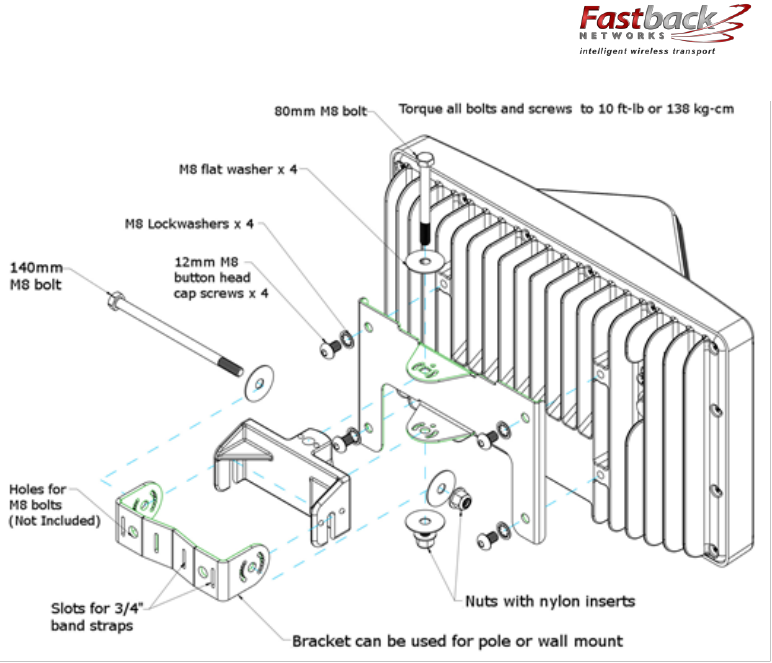 Fastback Networks’ wall/pole mounting bracket assembly can be used to mount IBR on poles, on