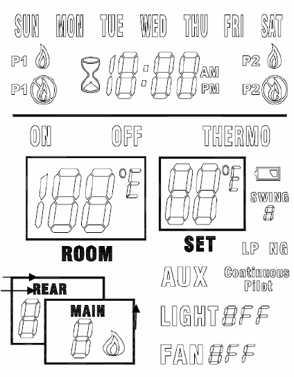 time the screen will show OFF. All the functions, MAIN FLAME/ REAR FLAME / FAN/ TIMER, will be