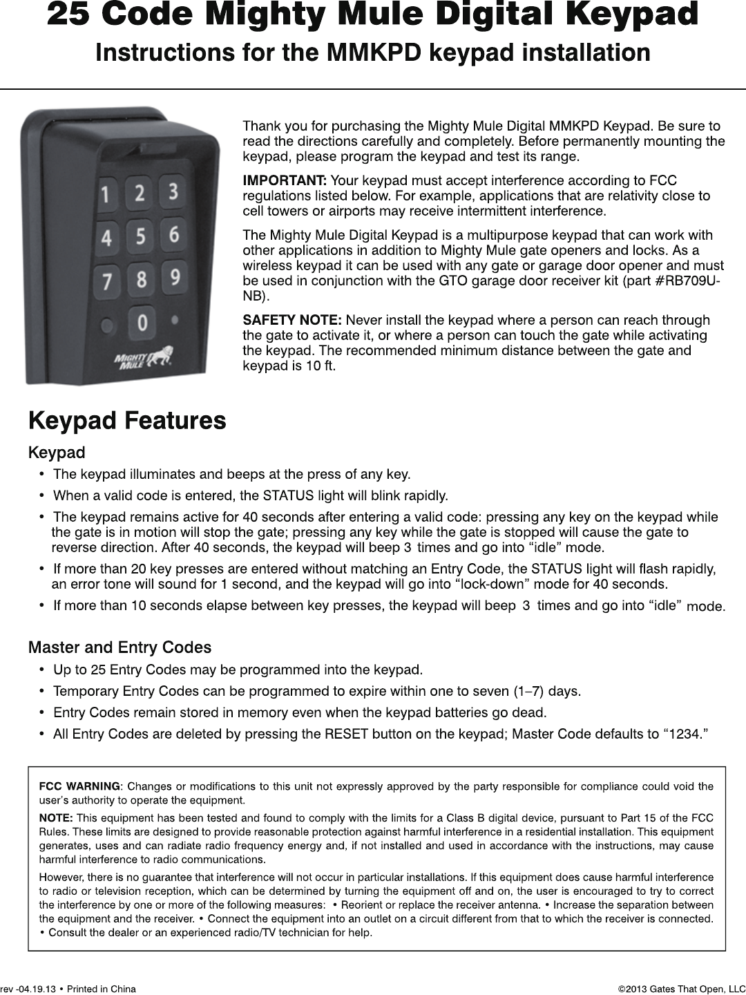 • A Master Code is needed to add, remove, or program Entry Codes.