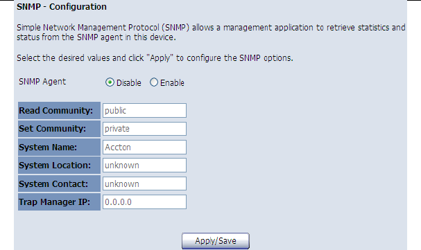 In this page, you may enable or disable the SNMP agent and set the parameters such