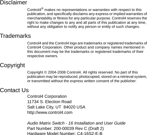 Snap One C416S2EB Audio Matrix Switch - 16 User Manual 200 00039 AudioMatrixSwitch