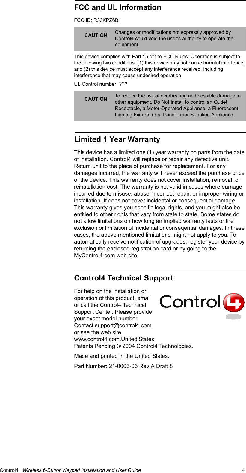 Control4 Wireless Keypad Model KPZ-6B1 Wireless6 ButtonKeypad