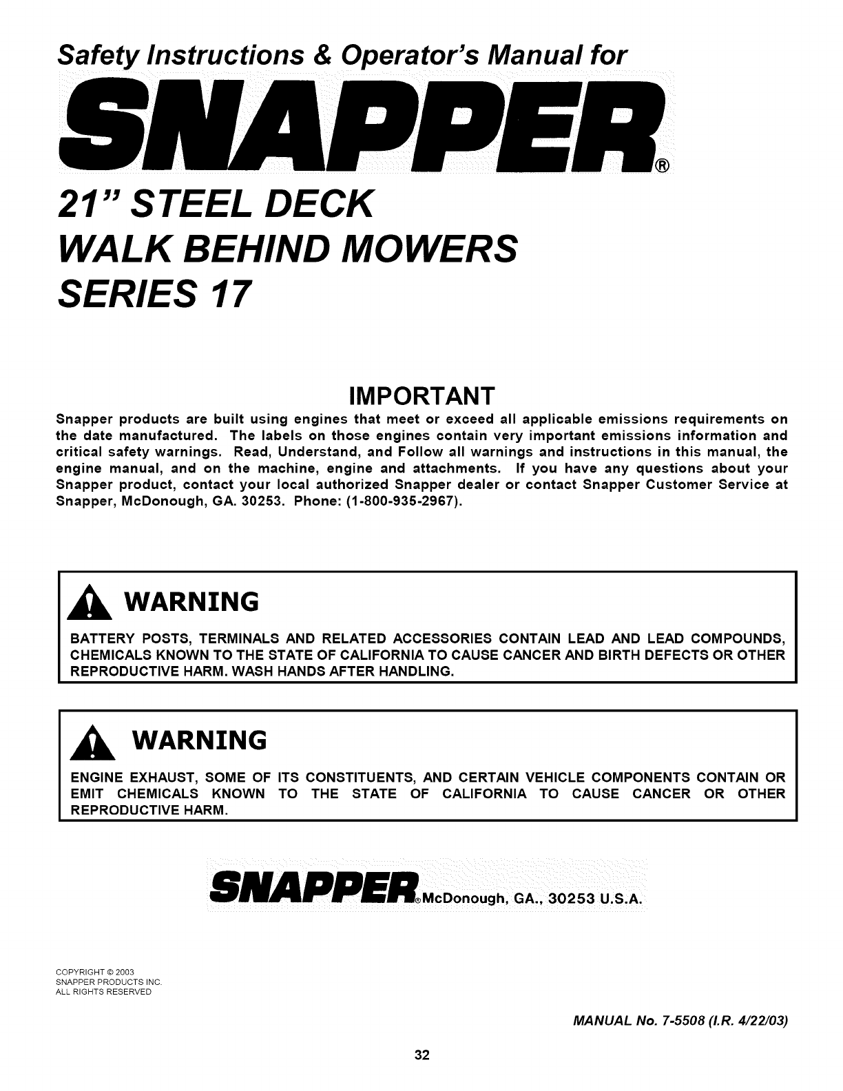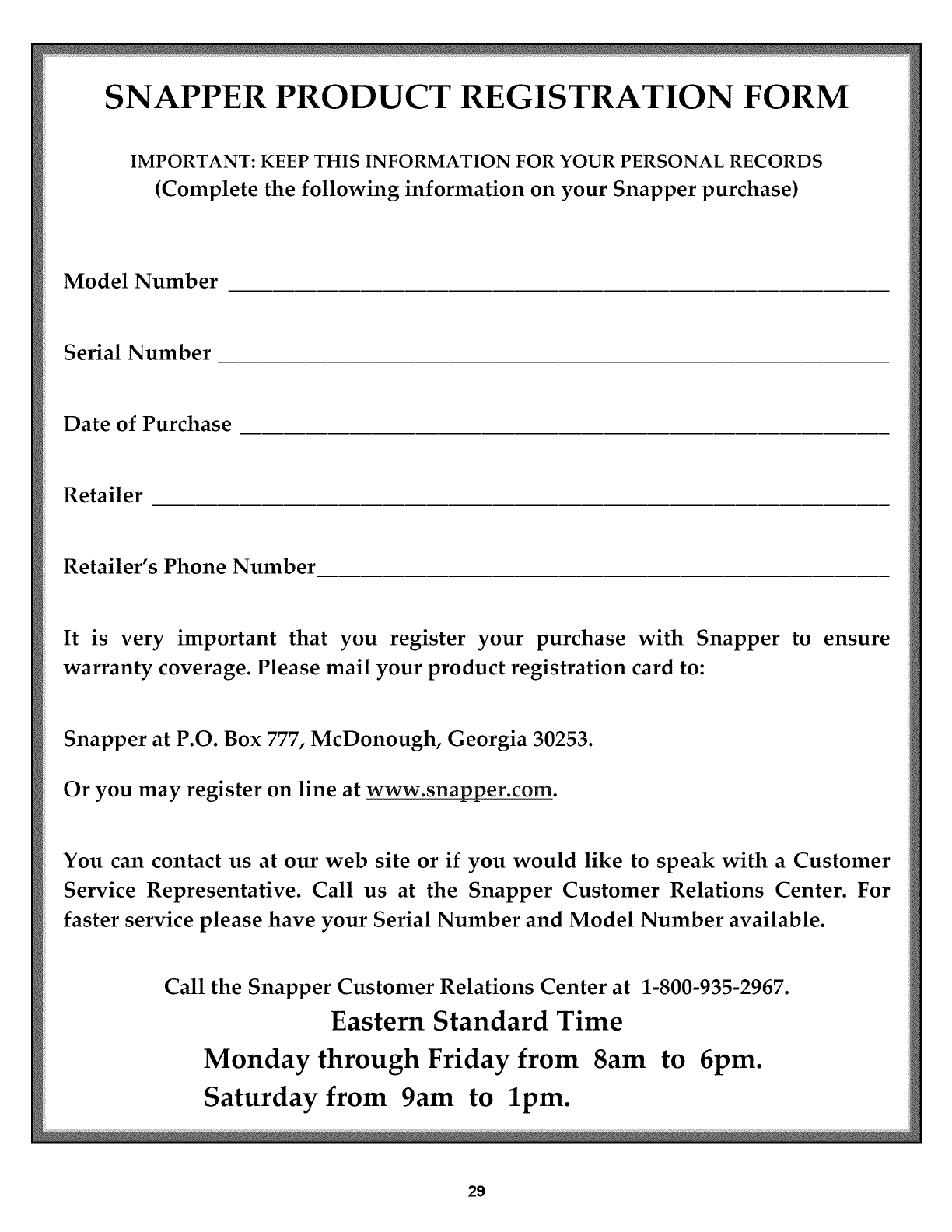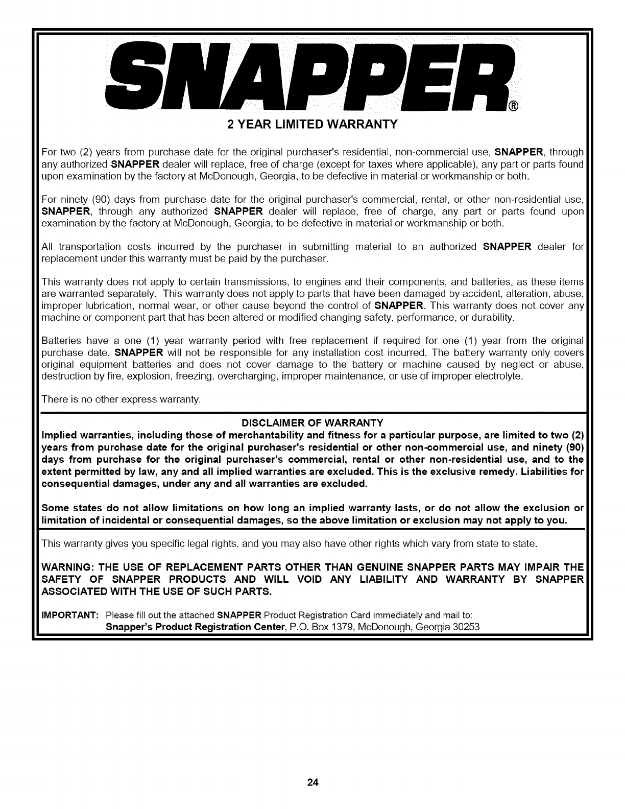 cannot answer to your satisfaction, call or write the Customer Service Department at SNAPPER, McDonough,