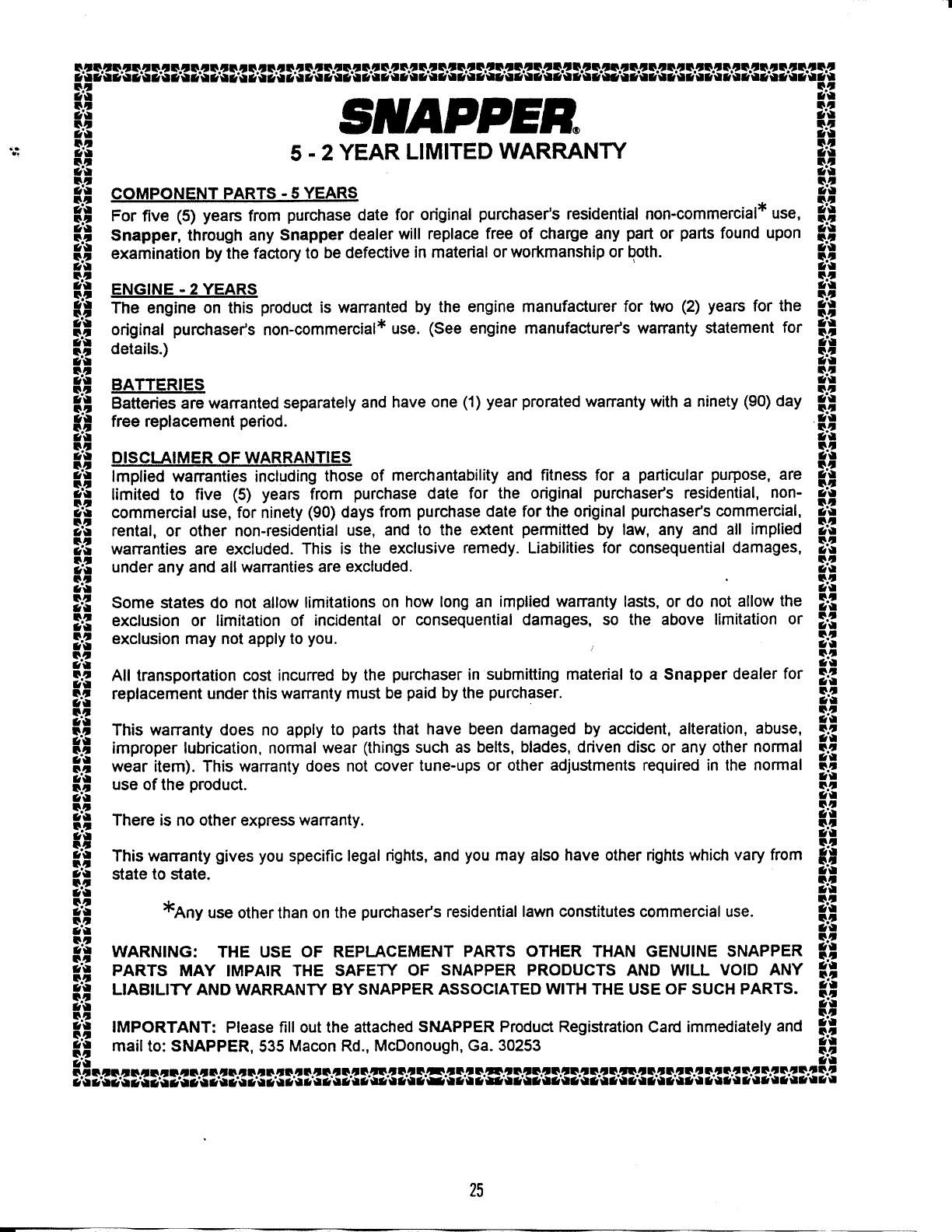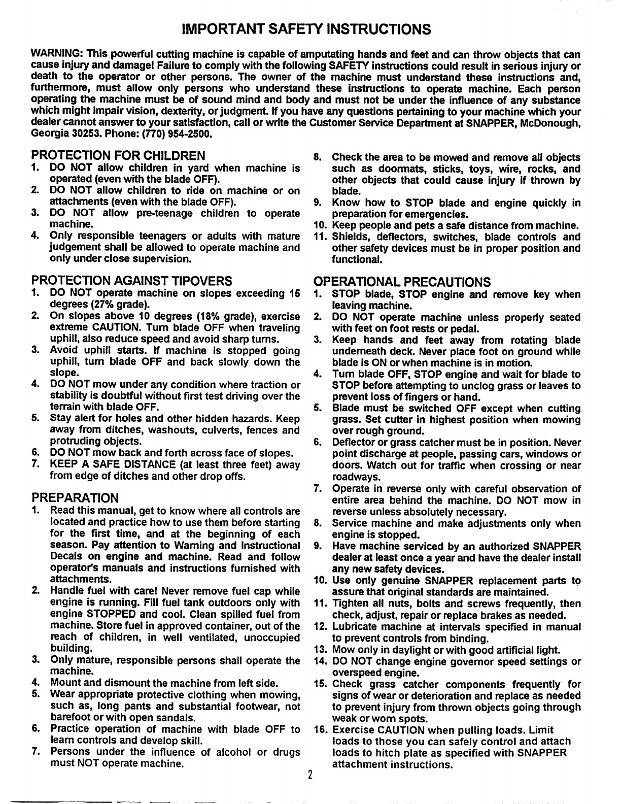dealer cannot answer to your satisfaction, call or write the Customer Service Department at SNAPPER, McDonough,